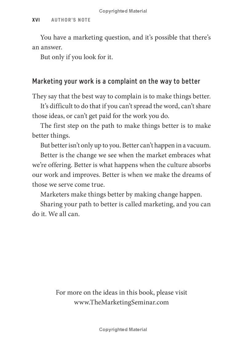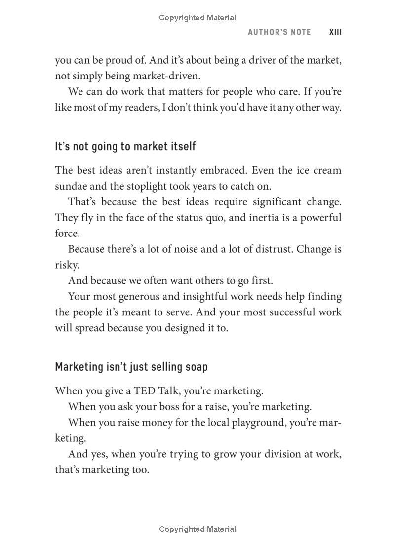 No matter what your product or service, this book will teach you how to reframe how it's presented to the world, in order to meaningfully connect with the people who want it. Seth employs his signature blend of insight, observation, and memorable examples to teach you: