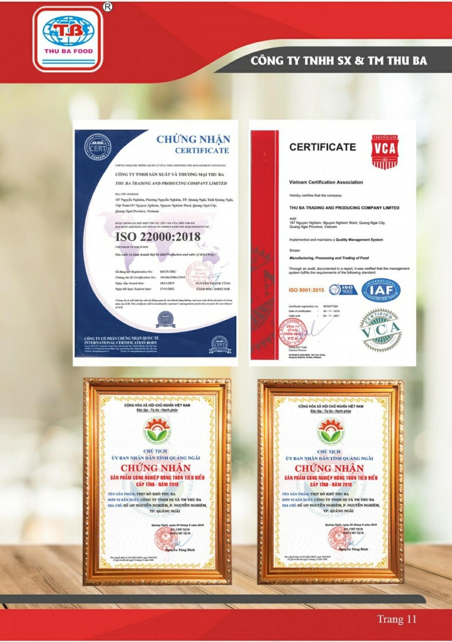 BÒ KHÔ THU BA là món đặc sản Quảng Ngãi, đạt tiêu chuẩn ISO 22000:2018 và là Hàng Việt Nam Chất Lượng Cao do Người tiêu dùng bình chọn Sản phẩm được sản xuất theo công thức