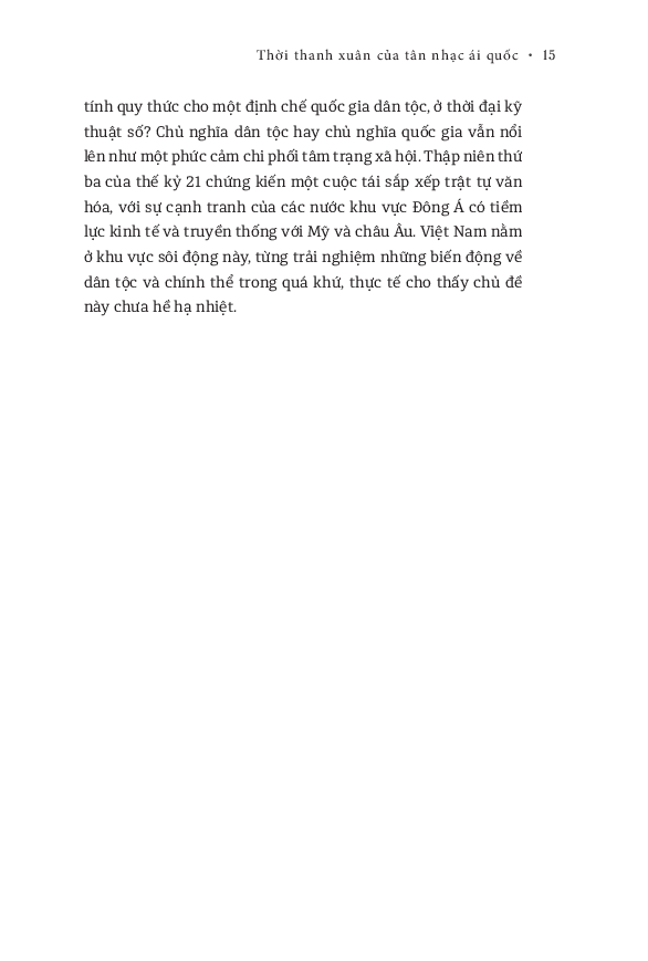 Nghiên cứu cũng khảo sát cuộc chuyển hóa của các tổ chức vốn dĩ gập ghềnh trước những vấn đề phân ly ý thức hệ xảy ra. Hà Nội là bối cảnh địa lý chính cho những hoạt động này diễn ra, và cũng mau chóng trở thành một chiến địa văn hóa khắc nghiệt trong suốt thập niên 1940 và cho đến tận những năm 1950 khi hòa bình lập lại ở miền Bắc. Cuối cùng, khi tập trung tìm hiểu các sản phẩm của Ban âm nhạc Tổng hội sinh viên Đông Dương với người đại diện là Lưu Hữu Phước, cũng như Văn Cao và nhóm Đồng Vọng cùng các hội đoàn văn hóa giáo dục trong thời điểm diễn ra tiến trình giành độc lập của một nước Việt Nam, nghiên cứu hướng đến việc làm sáng tỏ vai trò chính trị của hoạt động văn hóa giáo dục bên cạnh các cuộc đấu tranh vũ trang đã chi phối lịch sử mà số phận đất nước đã nếm trải.