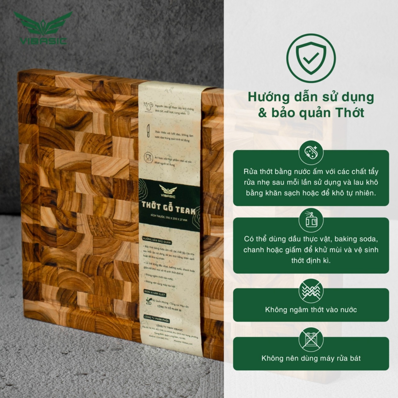 Thớt gỗ Teak Vibasic ghép dựng block, kích thước 300x200x25mm I.Đặc điểm nổi bật: - Được sản xuất tại nhà máy ra đời năm 1967- 56 năm kinh nghiệm - Đối tác công ty Cổ
