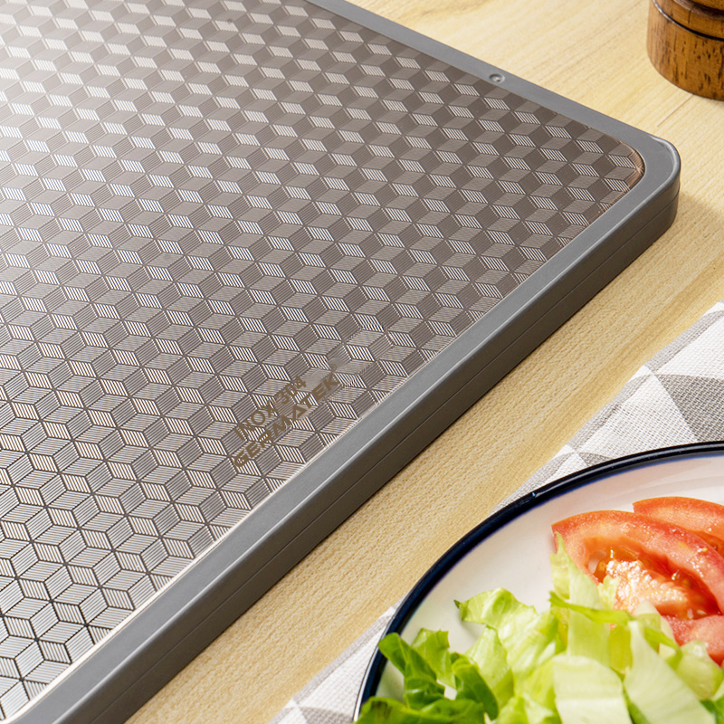 - Một mặt sử dụng chất liệu inox 304 thiết kế vân nổi Rubik tinh tế giảm thiểu độ trượt khi cắt thực phẩm đồng thời tạo độ thẩm mỹ theo thời gian cho thớt.