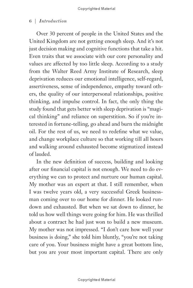 In Thrive, Arianna Huffington, the co-founder and editor-in-chief of the Huffington Post and one of the most influential women in the world, has written a passionate call to arms, looking to redefine what it means to be successful in today's world. She likens our drive for money and power to two legs of a three-legged stool. It may hold us up temporarily, but sooner or later we're going to topple over. We need a third leg - a Third Metric for defining success - in to live a healthy, productive, and meaningful life. In this deeply personal book, Arianna talks candidly about her own challenges with managing time and prioritising the demands of a career and two daughters. Drawing on the latest groundbreaking research and scientific findings in the fields of psychology, sports, sleep and physiology that show the profound and transformative effects of meditation, mindfulness, unplugging and giving, Arianna shows us the way to a revolution in our culture, our thinking, our workplaces, and our lives.