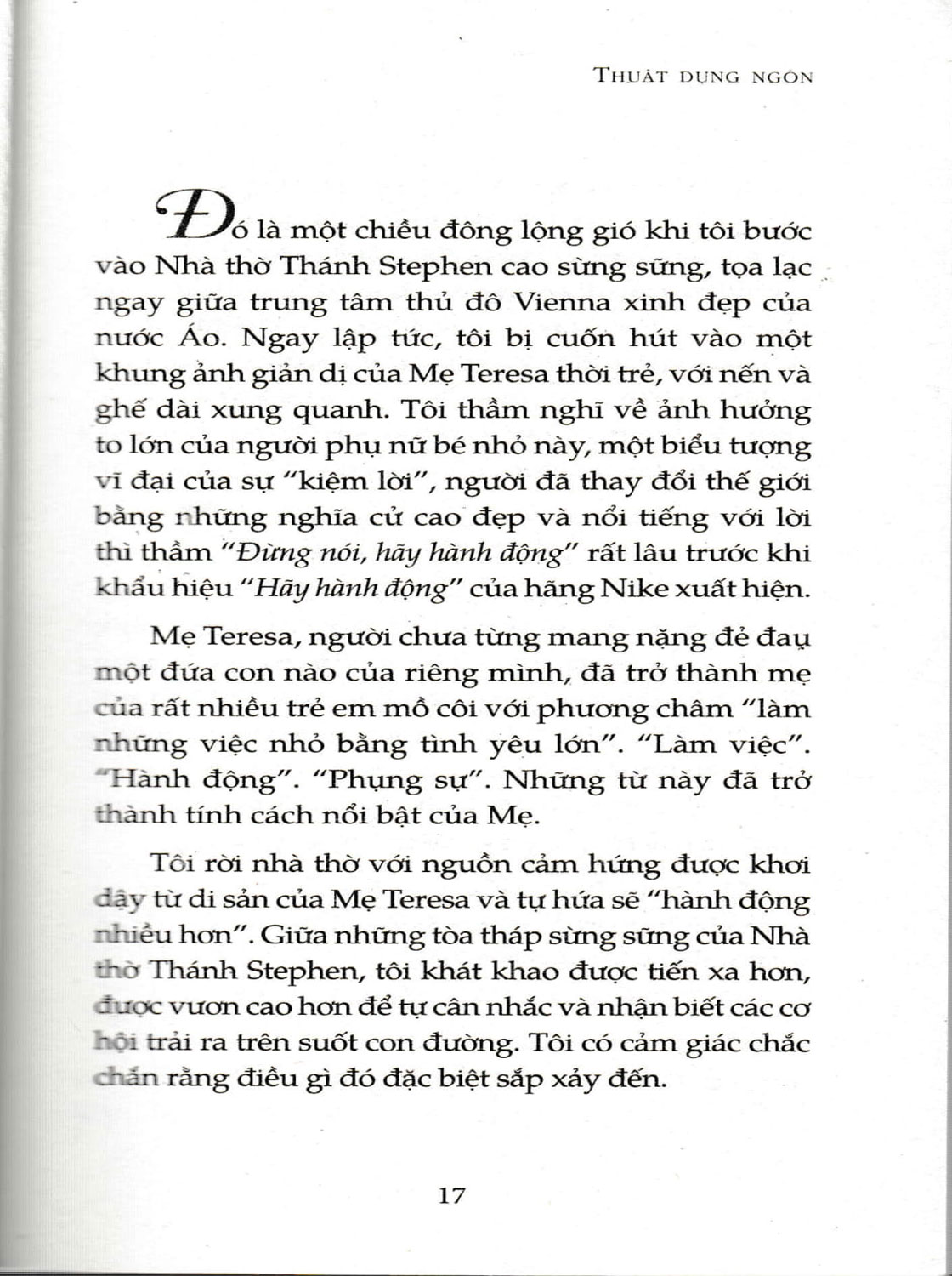 Thuật Dụng Ngôn, tựa cũ “Sức mạnh bí ẩn của 11 câu thần chú” được xem là một trong những cuốn sách về kỹ năng sống hay nhất. Quyển sách được chia thành 11 chương với 11 từ cốt lõi, và bạn có thể đọc đi đọc lại nhiều lần để trau dồi quá trình thay đổi hành vi lâu dài. Mô hình và bố cục của các chương phản ánh nền tảng kiến thức và kinh nghiệm của tác giả trong quá trình đào tạo và phát triển con người suốt hai mươi lăm năm qua. Năm chương đầu sẽ bàn về quá trình phát triển cá nhân – cách sử dụng sức mạnh bí ẩn của ngôn từ để tìm thấy con đường và mục đích của riêng bạn. Chương giữa có vai trò độc lập bởi đó là chủ đề trọng tâm của toàn bộ cuốn sách. Từ cốt lõi của nó là “humility”, tức sự khiêm tốn, một đặc điểm có sức ảnh hưởng mạnh mẽ mà tôi xem như “khởi nguồn của mọi đức hạnh” vì nó là yếu tố mấu chốt cho quá trình phát triển và hoàn thiện không ngừng. Năm chương cuối bàn về việc dẫn dắt người khác, bao gồm ngôn ngữ về vai trò lãnh đạo: nó không nói về bạn, nó nói về người khác.