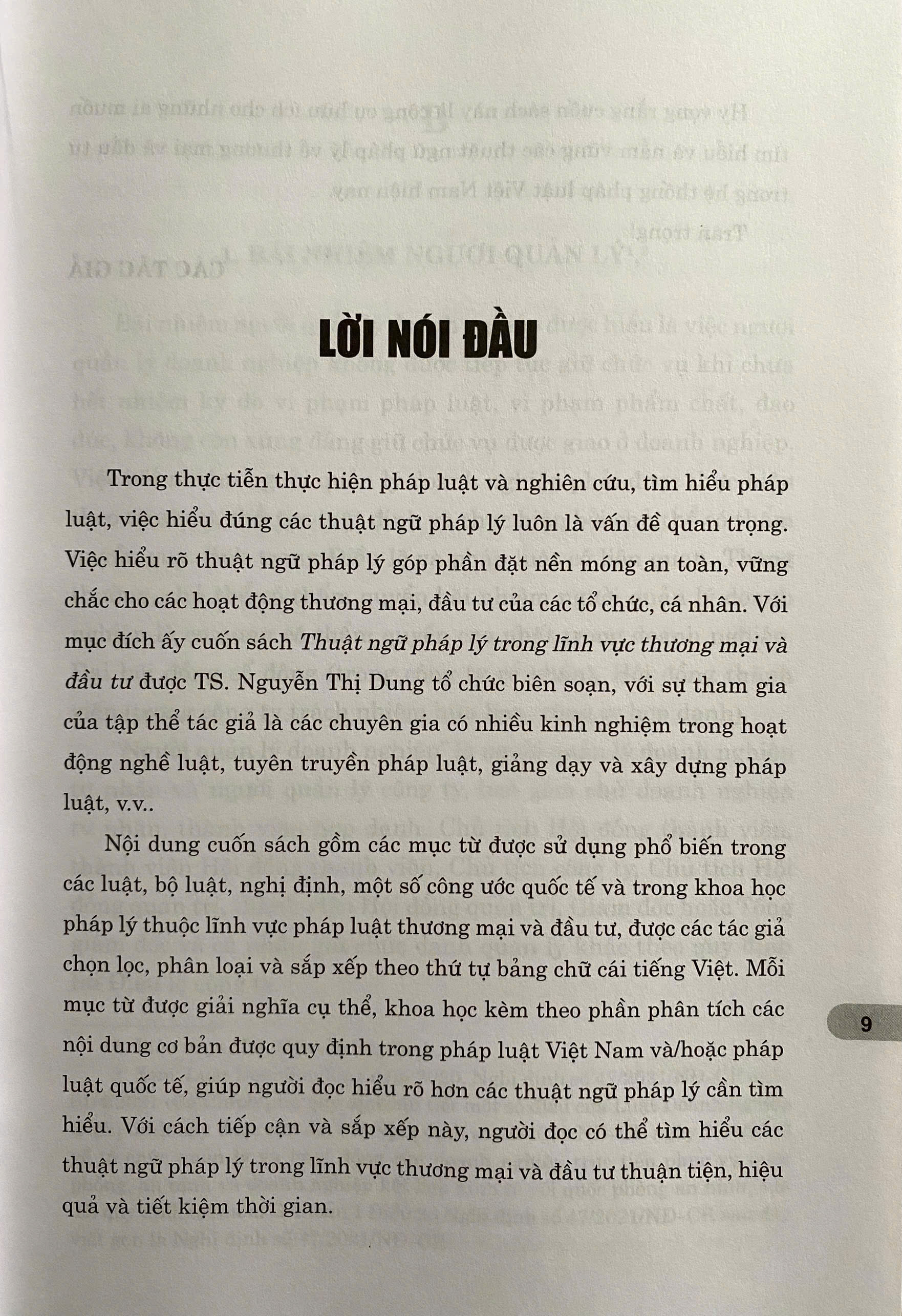 Đáp ứng nhu cầu của bạn đọc, Nhà xuất bản Chính trị quốc gia Sự thật xuất bản cuốn sách Thuật Ngữ Pháp Lý Trong Lĩnh Vực Thương Mại và Đầu Tư do TS. Nguyễn Thị Dung - Phó Trưởng Khoa Pháp luật Kinh tế, Trường Đại học Luật Hà Nội làm chủ biên. Cuốn sách đề cập 205 thuật ngữ pháp lý trong lĩnh vực thương mại và đầu tư, được sắp xếp theo thứ tự bảng chữ cái tiếng Việt để bạn đọc tra cứu các mục từ một cách dễ dàng. Mỗi thuật ngữ pháp lý được các tác giả trình bày, giải nghĩa một cách cụ thể, súc tích và ngắn gọn.