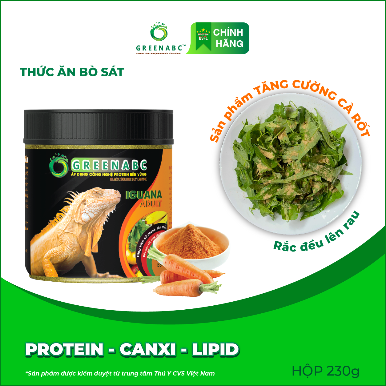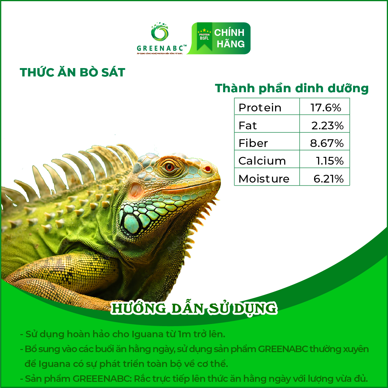 THỨC ĂN BÒ SÁT - BỔ SUNG DINH DƯỠNG PROTEIN, CANXI, LIPID GREENABC là thức ăn cao cấp dành cho các loại bò sát: IGUANA, BEARDED DRAGON, LEOPARD GECKO. Đặc biệt sản phẩm GREENABC được