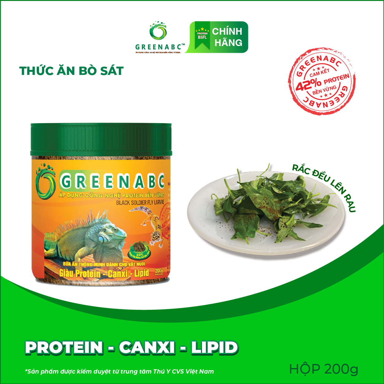 THỨC ĂN TẮC KÈ HOA CHAMELEON - BỔ SUNG DINH DƯỠNG PROTEIN 44.9%, CANXI 1.33%, LIPID 20.1% Sản phẩm GREENABC cung cấp các giá trị dinh dưỡng bền vững cho thú cưng, giúp cho