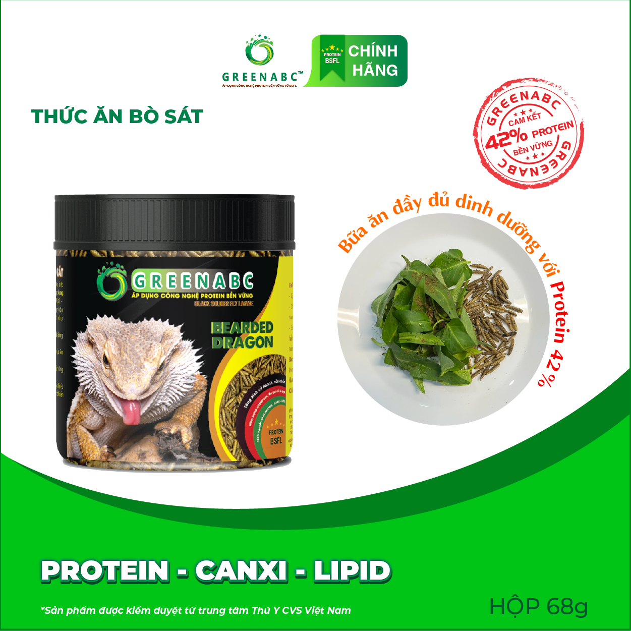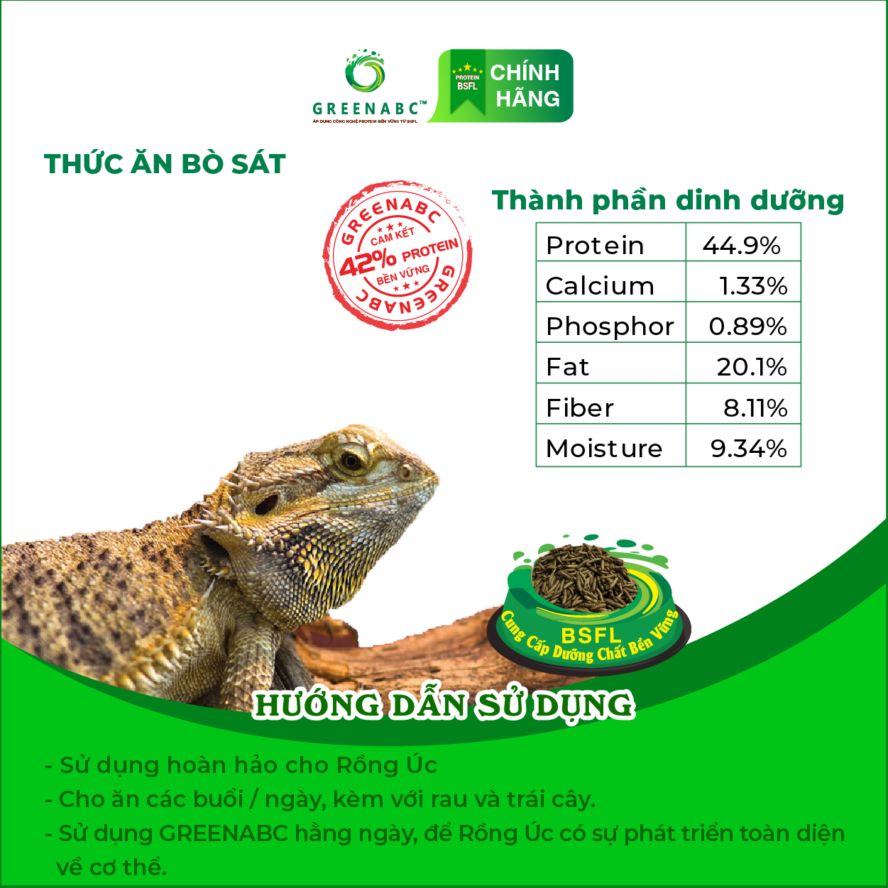 THỨC ĂN RỒNG ÚC, RỒNG RÂU - BỔ SUNG DINH DƯỠNG PROTEIN, CANXI, LIPID GREENABC là thức ăn cao cấp dành cho các loại Rồng Úc, Rồng Râu. Đặc biệt sản phẩm GREENABC được sản xuất theo phương pháp Áp dụng công nghệ PROTEIN BỀN VỮNG từ bột đạm G.Meal rất giàu PROTEIN–CANXI–LIPID có trong BSFL*, đã được Mỹ (AAFCO) và EU chấp nhận đưa vào công thức cho ngành sản xuất thức ăn dành cho thú cưng. Sản phẩm GREENABC cung cấp các giá trị dinh dưỡng bền vững cho thú cưng, giúp cho Rồng Râu / Úc:       + Kích thích vị giác, đặc biệt trong thời kì sinh sản giúp ăn ngon miệng hơn.       + Tăng cường sức đề kháng ngăn ngừa bệnh tật, tăng khả năng sinh sản.       + Tiêu hóa tốt, cơ thể hấp thu các dưỡng chất tối ưu. Đặc biệt với hàm lượng Canxi cao, sản phẩm GREENABC giúp cơ thể phát triển toàn diện về khung xương, gai đều.       + Kích thích sắc tố, giúp Rồng Úc lên màu đẹp.       + Cơ thể cân đối, săn chắc. Phân loại & hướng dẫn sử dụng sản phẩm: + Rồng Úc 68g: cho bé sử dụng hằng ngày như 1 món ăn yêu thích + Combo Rồng Úc 1, Combo Rồng Úc 2: => Rồng Úc 68g: cho bé sử dụng hằng ngày như 1 món ăn yêu thích => Thức ăn Bổ Sung Dinh Dưỡng 40g / 200g: tập thói quen cho bé ăn rau, trái cây hằng ngày, vì sản phẩm khi rắc lên rau, trái cây rất kích thích khứu giác và vị giác ăn ngon miêng. Lưu ý: khi sử dụng GREENABC - Thức ăn dinh dưỡng dành cho Thằn Lằn Da Báo, KHÔNG CẦN BỔ SUNG THÊM CANXI cho các bé. Vì sản phẩm có đầy đủ dưỡng chất PROTEIN - CANXI - LIPID có từ BSFL  Thành phần dinh dưỡng và hướng dẫn sử dụng: