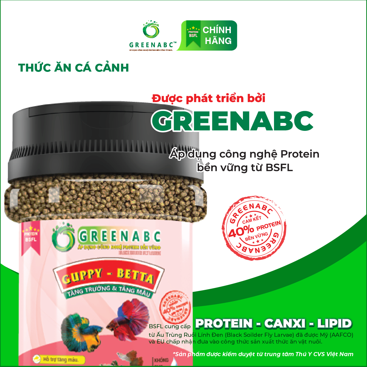 GREENABC là thức ăn cao cấp dành cho cá GUPPY & BETTA. Đặc biệt sản phẩm GREENABC được sản xuất theo phương pháp Áp dụng công nghệ PROTEIN bền vững từ bột đạm G.Meal rất giàu PROTEIN – CANXI – LIPID có trong BSFL, đã được Mỹ (AAFCO) và EU chấp nhận đưa vào công thức cho ngành sản xuất thức ăn cho vật nuôi.