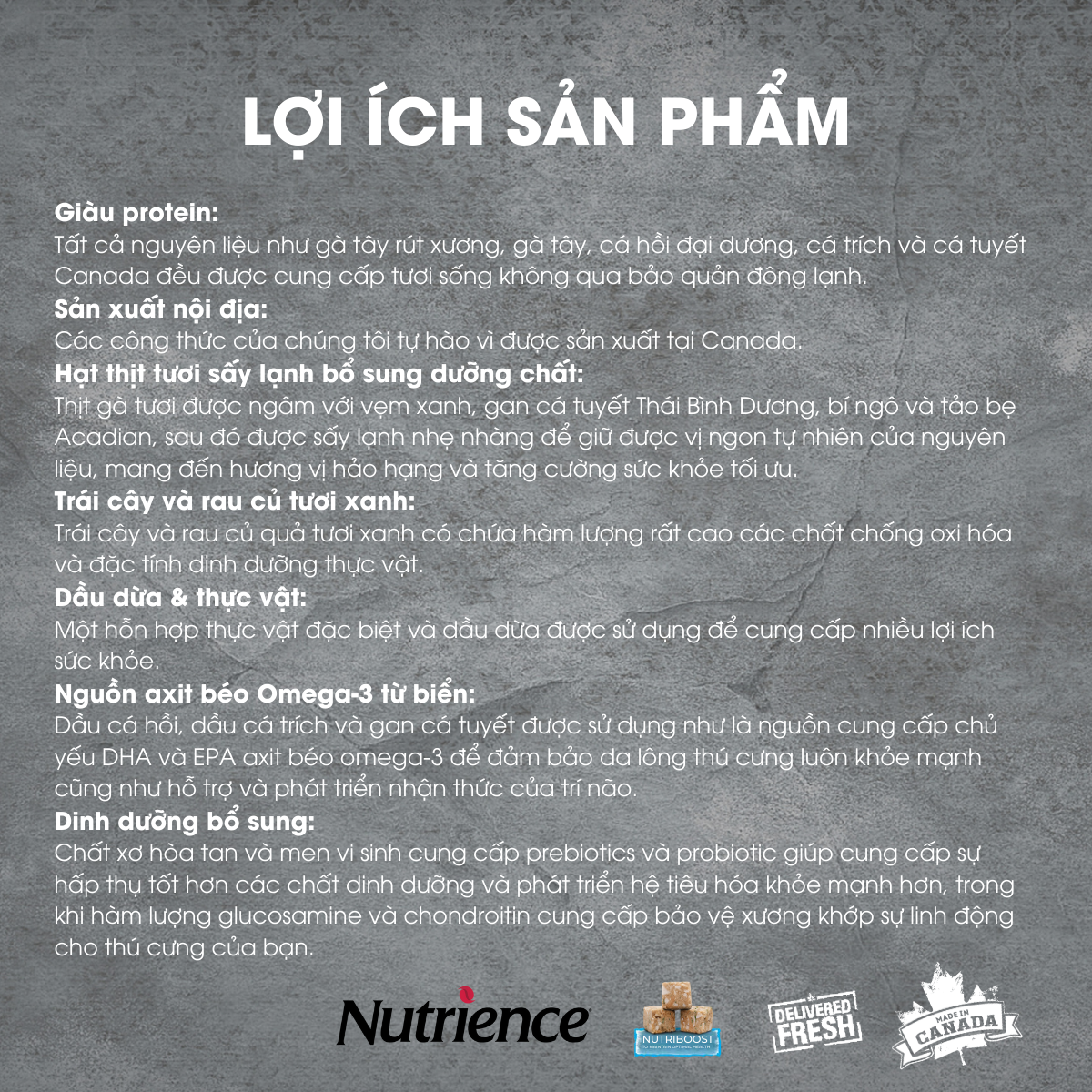Không chứa bắp, lúa mì , chất bảo quản và các phụ phẩm từ động vật