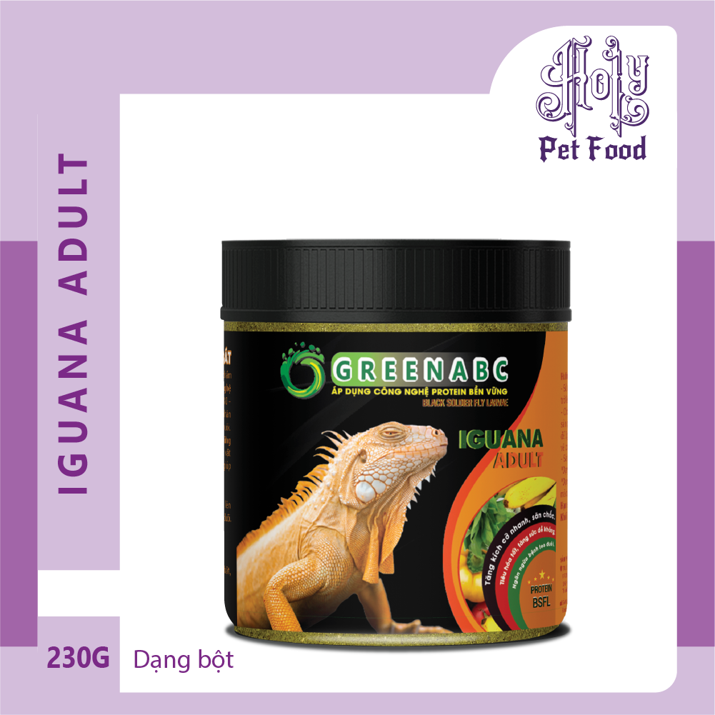 GREENABC là thức ăn cao cấp dành cho Iguana Trưởng Thành - Rồng Nam Mỹ Trưởng Thành. Đặc biệt sản phẩm GREENABC được sản xuất theo phương pháp Áp dụng công nghệ PROTEIN bền vững từ bột đạm G.Meal rất giàu PROTEIN – CANXI – LIPID có trong BSFL, đã được Mỹ (AAFCO) và EU chấp nhận đưa vào công thức cho ngành sản xuất thức ăn dành cho vật nuôi.
