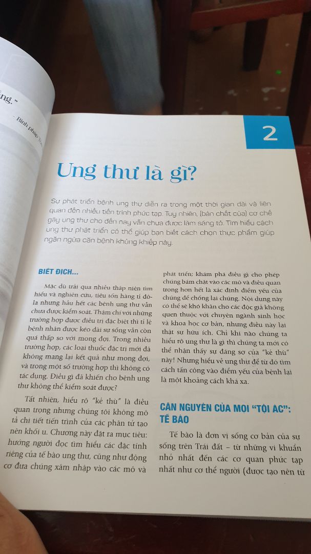 Những lời khuyên trong sách dựa trên vai trò tự nhiên của rau củ quả, bổ sung hợp chất thiết yếu vào cơ thể để chống lại ung thư. Ngoài ra, các dữ liệu khoa học cũng nêu bật vai trò của trái cây và rau củ tự nhiên trong việc cung cấp các phân tử đặc biệt chống ung thư.