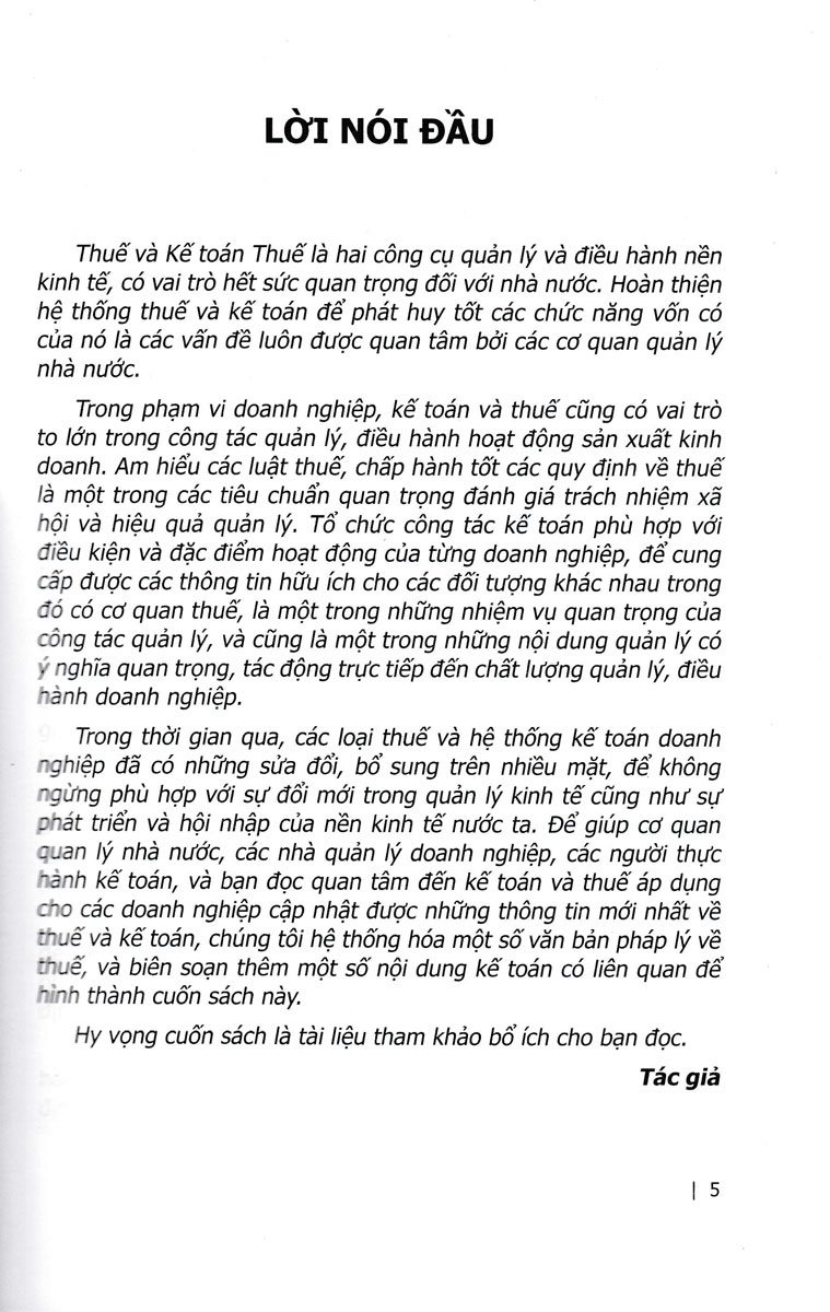 Trong thời gian qua, các loại thuế và hệ thống kế toán doanh nghiệp đã có những sửa đổi, bổ sung trên nhiều mặt, để không ngừng phù hợp với sự đổi mới trong quản lý kinh tế cũng như sự phát triển và hội nhập của nền kinh tế nước ta. Để giúp cơ quan quản lý nhà nước, các nhà quản lý doanh nghiệp, các người thực hành kế toán, và bạn đọc quan tâm đến kế toán và thuể áp dụng cho các doanh nghiệp cập nhật được những thông tin mới nhất về thuế và kế toán, chúng tôi hệ thống hóa một số văn bản pháp lý về thuế, và biên soạn thêm một số nội dung kế toán có liên quan để hình thành cuốn sách này