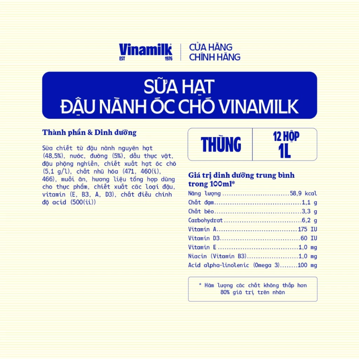 Mua tại Tiktok• Sữa đậu nành Vinamilk hạt Óc chó hộp 1L • Sữa đậu nành Hạt óc chó Vinamilk Ít đường được làm từ hạt óc chó cao cấp từ Mỹ và 100% đậu nành không biến đổi gen, giữ trọn vị béo đậm đà của hạt óc chó. Bổ sungvitamin A, D3, E, PP và Omega 3, mang lại lợi ích3 TỐTcho cả gia đình: • Tốt cho vóc dáng • Tốt cho làn da • Tốt cho trí não