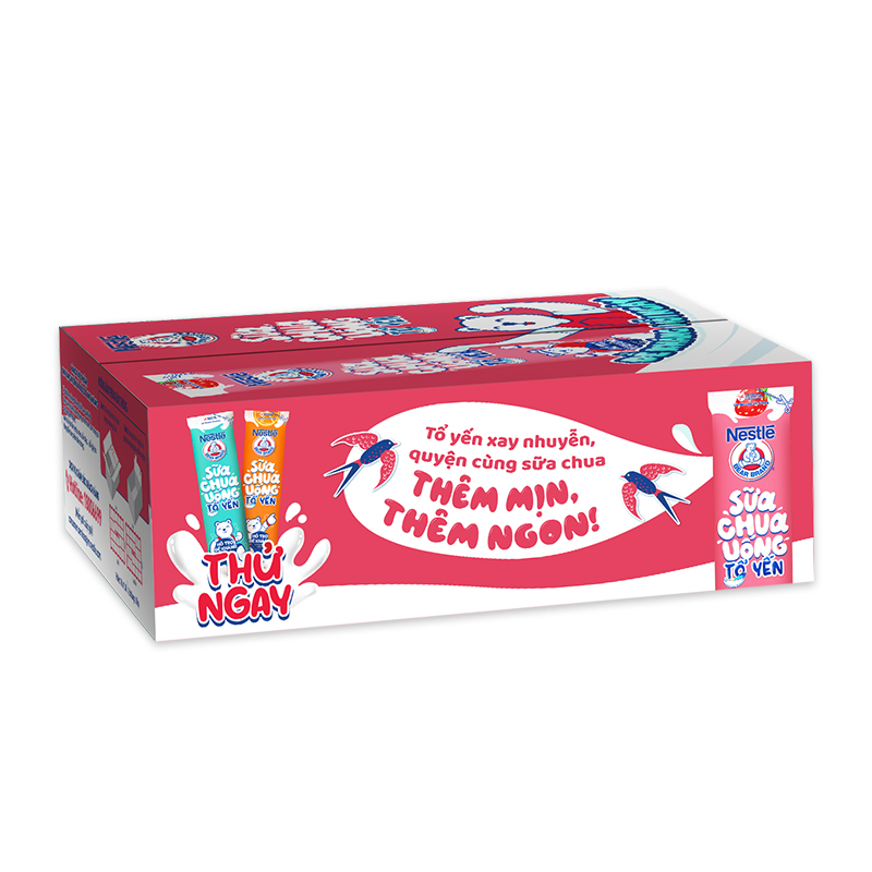 Mẹ luôn mong muốn cung cấp đầy đủ dưỡng chất thiết yếu cho giai đoạn phát triển quan trọng của con để trẻ có một thể chất và đề khánh mạnh mẽ khám phá thế giới? Sữa Chua Tổ Yến Nestlé Gấu có nhiều ưu điểm nổi trội sẽ cùng mẹ mang đến cho trẻ 1 sản phẩm chất lượng cao với hương vị thơm ngon. Với 2-3 gói Sữa chua Tổ Yến Nestle Gấu, mẹ yên tâm trẻ vừa được thưởng thức vị chua ngọt yêu thích vừa hỗ trợ sức đề kháng mỗi ngày. ĐẶC ĐIỂM NỔI BẬT - Có chứa Tổ Yến và các loại dưỡng chất thiết yếu. - Đặc biệt, có chứa Kẽm & Vitamin C được khoa học công nhận hỗ trợ sức đề kháng mỗi ngày. - Vị ngọt nhẹ và chua thanh cùng với tổ yến xay nhuyễn thích hợp với khẩu vị của trẻ để trẻ luôn háo hức uống mỗi ngày. - Có thể thưởng thức bằng hai cách: UỐNG LỎNG, ĂN ĐÔNG đều ngon THÀNH PHẦN Sữa - milk 53 % (nước, sữa bột), nước, đường, sữa chua lên men 3% (nước, bột sữa chua (from milk) lên men từ Streptococcus thermophilus, Lactobacillus bulgaricus), sirô glucose, dầu thực vật, chất điều chỉnh độ acid (270, 330), hương liệu giống tự nhiên (hương dâu), chất ổn định (466, 418, 440), các khoáng chất (calci phosphat, kẽm sulfat), nước cốt táo, vitamin C, chất tạo ngọt tự nhiên steviol glycosid từ stevia, chất nhũ hóa lecithin - chiết xuất từ đậu nành (soya lecithin), chất tạo màu tự nhiên carmin, tổ yến tinh chế 11 mg/l. LƯU Ý Không dùng cho người dị ứng với các thành phần của sản phẩm HƯỚNG DẪN SỬ DỤNG Lắc đều trước khi uống. Ngon hơn khi uống lạnh. NHU CẦU KHUYẾN NGHỊ Sử dụng 2-3 gói Sữa chua Tổ Yến Nestlé Yogu mỗi ngày. BẢO QUẢN Bảo quản sản phẩm nơi khô ráo, thoáng mát, tránh ánh nắng trực tiếp. Xuất xứ thương hiệu: Thuỵ Sĩ Nơi sản xuất: Việt Nam Ngày sản xuất: Xem trên bao bì Hạn sử dụng: 8 tháng kể từ ngày sản xuất THÔNG TIN THƯƠNG HIỆU Nestlé là tập đoàn thực phẩm, dinh dưỡng và thức uống lớn trên thế giới với bề dày lịch sử hơn 150 năm kinh nghiệm không ngừng cải tiến và phát triển. Với hơn 2000 nhãn hiệu khác nhau, từ các thương hiệu biểu tượng toàn cầu cho đến các thương hiệu địa phương được yêu thích, mục đích của Nestlé là nâng cao chất lượng cuộc sống và góp phần vào một tương lai khỏe mạnh hơn. Nestle Yogu hân hạnh đồng hành cùng mẹ mang đến cho trẻ em Việt Nam sản phẩm sữa chua uống dinh dưỡng có chứa Tổ Yến & 5 loại Vitamin cùng khoáng chất, giúp trẻ MẠNH MẼ.