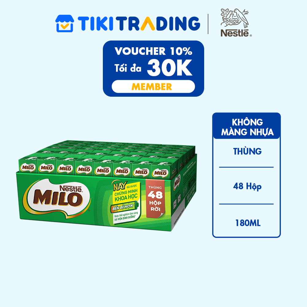 Thùng Sữa lúa mạch Nestlé MILO thùng 48 hộp rời x 180ml không màng nhựa (48x180ml)