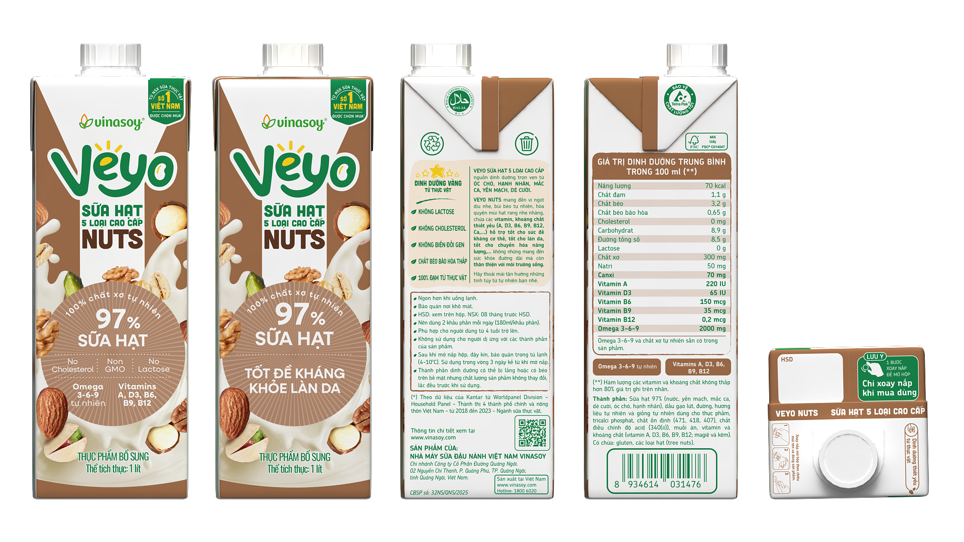 Veyo sữa hạt 05 loại cao cấp nguồn dinh dưỡng trọn vẹn từ Óc chó, Hạnh nhân, Mắc ca, Yến Mạch, Dẻ cười. Mang đến vị ngọt dịu nhẹ, bùi béo tự nhiên, hòa quyện mùi hạt rang nhẹ nhàng, chứa các vitamin, khoáng chất tthiết yếu (A, D3, B6, B9, B12, Ca,...) hỗ trợ tốt cho sức đề kháng cơ thể, tốt cho làn da, tốt cho chuyển hóa năng lượng,... không những mang đênsức khỏe đường dài mà còn thân thiện với môi trường sống. HỘP 1 LÍT MỚI - CHIỀU MỌI Ý THÍCH, THỎA SỨC SÁNG TẠO