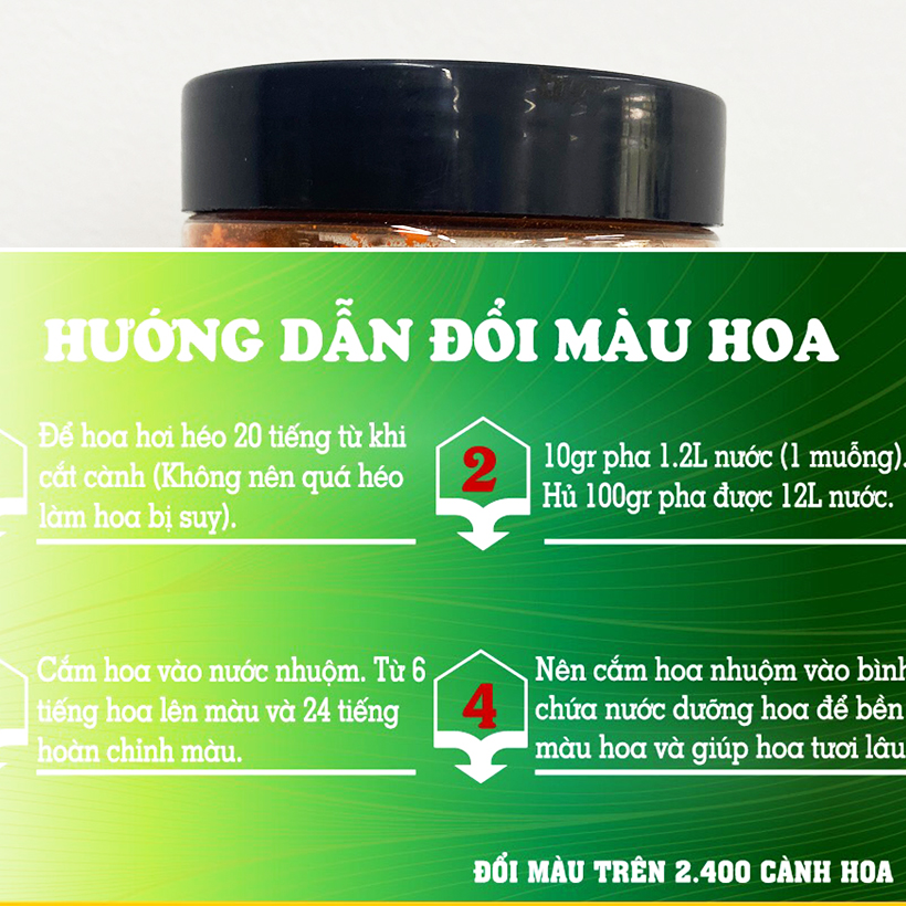 110gr pha được 12L nước. Dùng 1 muỗng hồng 10gr pha với 1L nước và nhuộm trên 250 cành hoa