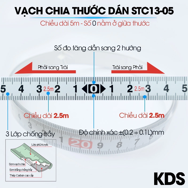 - Thước dán cao cấp KDS STC13-05BP được làm từ thép Carbon có cấu tạo 3 lớp chống trầy, lỡ tay kẻ vào dây thước dán thì vẫn không bị ảnh hưởng đến thước.