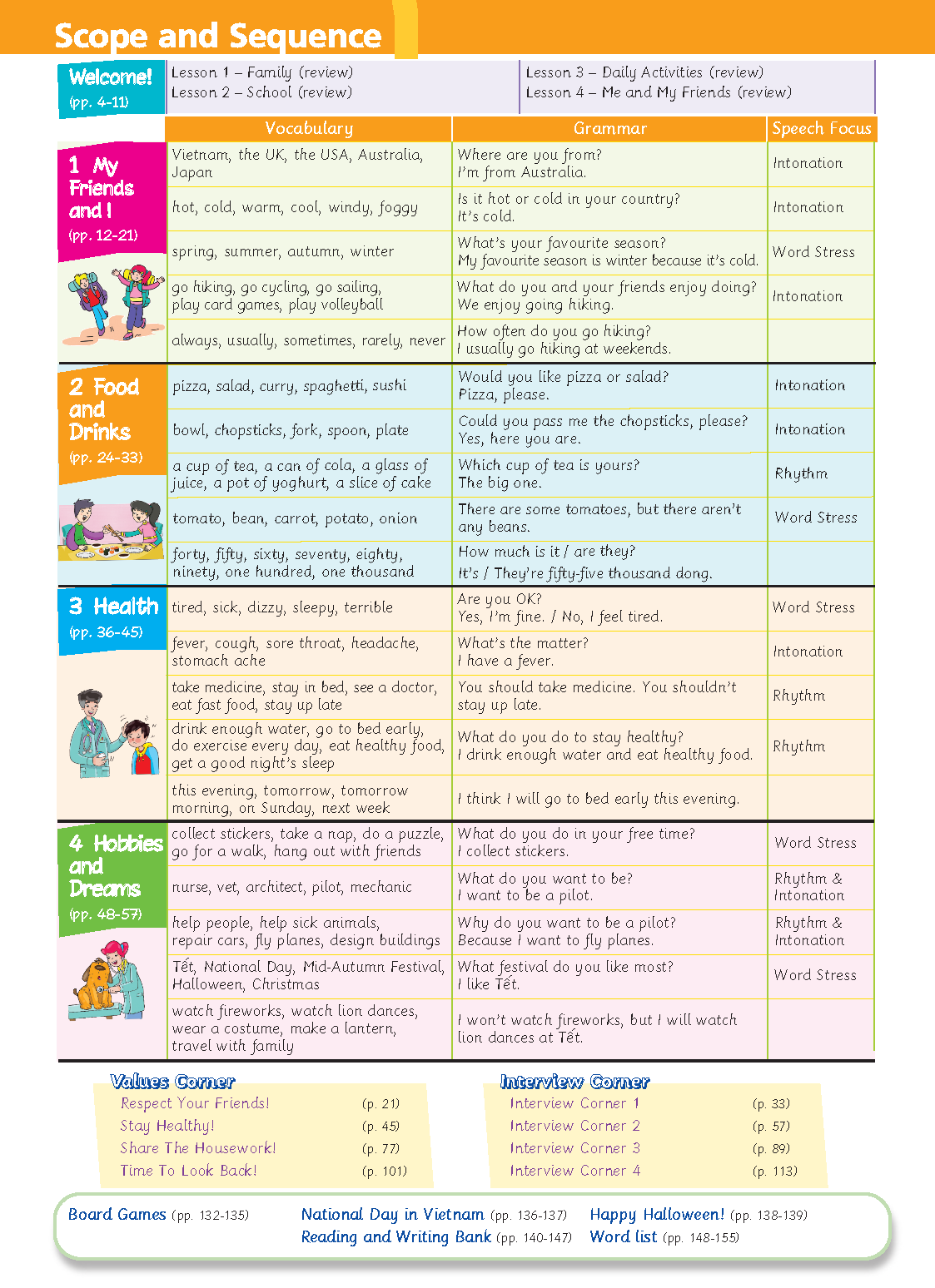 Sách: Learning English 4 - Dành Cho Học Sinh Lớp 4 NỘI DUNG VÀ CẤU TRÚC CỦA QUYỂN SÁCH : Bảng mục lục: Chỉ rõ các mục tiêu chính và trọng tâm của mỗi bài
