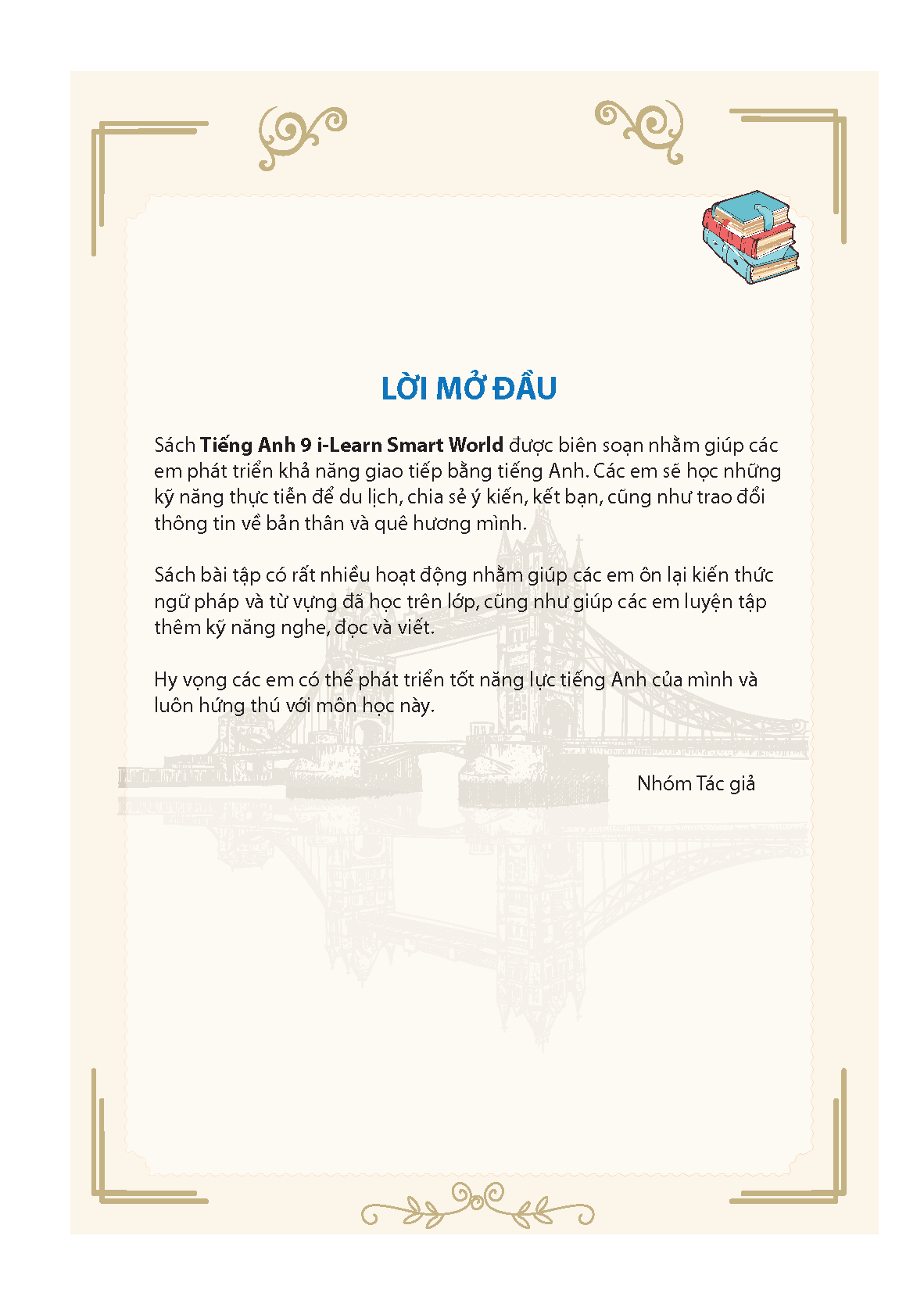 Mua tại TiktokTiếng Anh i-Learn Smart World là khóa học 4 cấp độ tiếng Anh dành cho học sinh THCS. i-Learn Smart World đã được phát triển bởi một đội ngũ giàu kinh nghiệm gồm các nhà văn, giáo viên quốc tế và Việt Nam để trở nên hoàn hảo cho lớp học Việt Nam và bao gồm đầy đủ chương trình giảng dạy quốc gia của Việt Nam và Khung Tham chiếu Ngôn ngữ Chung Châu Âu (CEFR). Tiếng Anh 9 i-Learn Smart World đã được Bộ Giáo dục và Đào tạo thẩm định và phê duyệt.