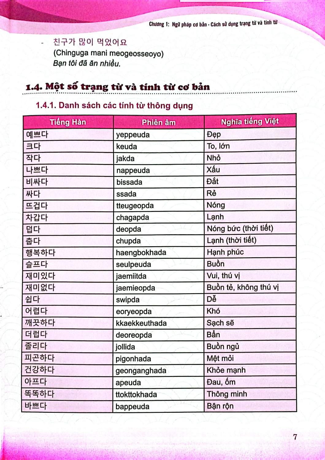 Tiếng Hàn Tổng Hợp Dành Cho Người Việt Nam - Sơ Cấp 1 - Sách Bài Tập Nếu bạn đã có trong tay cuốn Giáo trình tiếng Hàn tổng hợp dành cho người Việt Nam – sơ cấp 1 thì ngay lập tức phải sở hữu thêm cuốn sách bài tập này. Sách bài tập tiếng Hàn tổng hợp sơ cấp 1 được biên tập với mục đích nhằm hỗ trợ cho việc ôn tập và luyện tập nâng cao của những người học quyển Giáo trình tiếng Hàn tổng hợp sơ cấp 1. Sách bài tập sơ cấp 1 – bổ trợ cho Giáo trình tiếng Hàn tổng hợp được chia thành 3 phần chính sau đây: Phần 1: Luyện tập từ vựng. Phần này giúp cho người học ôn tập và luyện tập nâng cao trên cơ sở các từ vựng phù hợp với nội dung và chủ đề được học trong giáo trình chính. Phần 2: Phần luyện tập ngữ pháp giúp luyện tập các cấu trúc ngữ pháp cơ bản đã học trong giáo trình chính. Ngoài ra, bằng việc so sánh những cấu trúc ngữ pháp đã học trong giáo trình chính giúp người học có thể học ngữ pháp một cách có hệ thống. Phần 3: Phần ôn luyện tổng hợp các kỹ năng giao tiếp như: Nghe – Nói – Đọc – Viết. Đặc biệt trong phần này còn có những bài luyện đa dạng nhằm nâng cao năng lực hoạt động thực tế cho người học. Thông qua từng phần trong cuốn sách bài tập, người học sẽ được mở rộng phạm vi học tập từ vựng, ngữ pháp; có thể hiểu và thực hiện được những hội thoại thích hợp. Giáo trình tiếng Hàn tổng hợp dành cho người Việt Nam – Sách bài tập sơ cấp 1 Giáo trình tiếng Hàn tổng hợp dành cho người Việt Nam – Sơ cấp 1 được biên soạn dành cho người Việt Nam muốn học tiếng Hàn ở trình độ sơ cấp. Sách được biên soạn nhằm hướng tới việc sử dụng được trong các tiết học tiếng Hàn tại giảng đường đại học nên mỗi bài học được chia thành nhiều phần như: Lý thuyết cơ bản gồm từ vựng và cấu trúc ngữ pháp; phần luyện tập theo 4 kỹ năng giao tiếp như: Nghe – Nói – Đọc – Viết, phần luyện phát âm, phần tìm hiểu văn hóa…