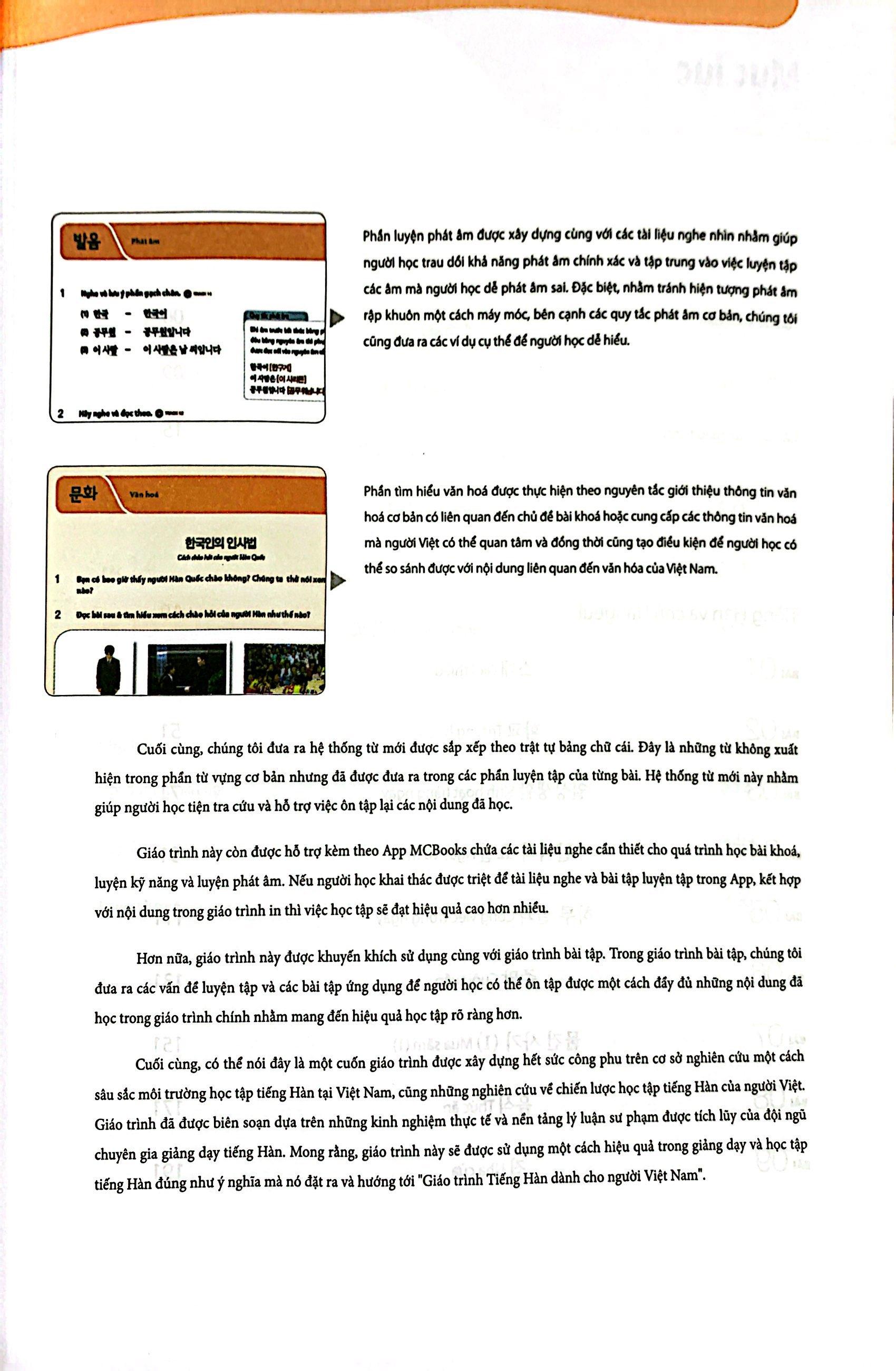 Tiếng Hàn Tổng Hợp Dành Cho Người Việt Nam - Sơ Cấp 1 Trong những năm gần đây, nhu cầu học tiếng Hàn và tìm hiểu về văn hóa Hàn Quốc đang có xu hướng tăng lên. Người học tiếng Hàn rất mong muốn có được một bộ giáo trình chuẩn, được biên soạn một cách tỉ mỉ và hữu ích nhất. Giáo trình tiếng Hàn tổng hợp lần đầu tiên được trao bản quyền chính thức tại Việt Nam Hiểu được điều đó, ngày 4-7, Đại diện chính phủ Hàn Quốc, ngài Woo Hyeong Min – Trưởng đại diện Văn phòng Quỹ giao lưu Quốc tế HQ tại Việt Nam cùng GS.TS.NGƯT Mai Ngọc Chừ – Chủ tịch Hội Nghiên cứu khoa học về Hàn Quốc của Việt Nam (KRAV) đã trao quyết định cho phép Công ty Cổ phần sách MCBooks của Việt Nam được xuất bản cuốn sách này tại thị trường Việt Nam. Và đây chính là bộ giáo trình tiếng Hàn tổng hợp đầu tiên có bản quyền chính thức có mặt tại Việt Nam. Cũng theo ông Woo Hyeong Min, Thực tế đây là bộ giáo trình chính thống mà tất cả người học tiếng Hàn tại Việt Nam cần sử dụng. Tuy nhiên nhiều năm qua bộ sách đến tay người dùng đều là sách lậu nên chưa đạt được kết quả mà chính phủ Hàn muốn mang tới Việt Nam. Do đó Chính phủ Hàn Quốc đã quyết định tìm 1 đơn vị xuất bản uy tín của Việt Nam để giúp họ mang đến cho người học những cuốn sách tiếng Hàn chất lượng tốt với giá cả hợp lý. Bộ giáo trình được Hội nghiên cứu khoa học Hàn Quốc của Việt Nam biên soạn và hiệu đính. Bộ giáo trình sẽ giúp nâng cao hiệu quả trong việc sử dụng ngôn ngữ Hàn sau tiếng mẹ đẻ và tiếng Anh, là nền tảng giúp người lao động Việt Nam nhận được những vị trí làm việc cao trong doanh nghiệp Hàn Quốc. Đây cũng là cách để thúc đẩy quan hệ hợp tác về văn hoá và giáo dục giữa hai nước trong thời gian tới. Giới thiệu cuốn Giáo trình tiếng Hàn tổng hợp dành cho người Việt Nam – Sơ cấp 1 Giáo trình tiếng Hàn tổng hợp dành cho người Việt Nam – Sơ cấp 1 được biên soạn dành cho người Việt Nam muốn học tiếng Hàn ở trình độ sơ cấp. Sách được biên soạn nhằm hướng tới việc sử dụng được trong các tiết học tiếng Hàn tại giảng đường đại học nên mỗi bài học được chia thành nhiều phần như: Lý thuyết cơ bản gồm từ vựng và cấu trúc ngữ pháp; phần luyện tập theo 4 kỹ năng giao tiếp như: Nghe – Nói – Đọc – Viết, phần luyện phát âm, phần tìm hiểu văn hóa… Các chủ đề trong sách được sắp xếp một cách có hệ thống và liên quan chặt chẽ với nhau. Giáo trình tiếng Hàn tổng hợp được biên soạn kèm theo một cuốn sách bài tập hỗ trợ giúp người học ôn tập kỹ hơn và có thể luyện tập nâng cao trong những trường hợp cần thiết. Nội dung trong Giáo trình tiếng Hàn tổng hợp – Sơ cấp 1 2 cuốn sách trong bộ Sơ cấp được xây dựng với 30 bài khóa và bảng chữ cái. Trong đó quyển 1 gồm phần bảng chữ cái và 15 bài đầu. Học hết quyển 1, bạn sẽ học đến quyển sơ cấp 2 với 15 bài còn lại. Cấu trúc tổng thể của giáo trình được xây dựng theo các chủ đề; mỗi chủ đề được liên kết thống nhất với một hệ thống các từ vựng và cấu trúc ngữ pháp cơ bản, bài tập ứng dụng, kỹ năng và tìm hiểu văn hóa. Trong mỗi bài học, nội dung học được chia thành các phần như: luyện từ vựng, luyện ngữ pháp cơ bản, luyện tập kỹ năng nghe – nói – đọc – viết, luyện phát âm, tìm hiểu văn hóa của đất nước Hàn Quốc xinh đẹp. Và kết thúc mỗi bài đều có thêm bảng từ mới xuất hiện trong bài học. Phần cuối của sách, các tác giả đưa ra hệ thống từ mới được sắp xếp theo thứ tự của bảng chữ cái. Đây là những từ không xuất hiện trong phần ngữ pháp, từ vựng cơ bản; nhưng lại xuất hiện nhiều ở phần luyện tập của từng bài.