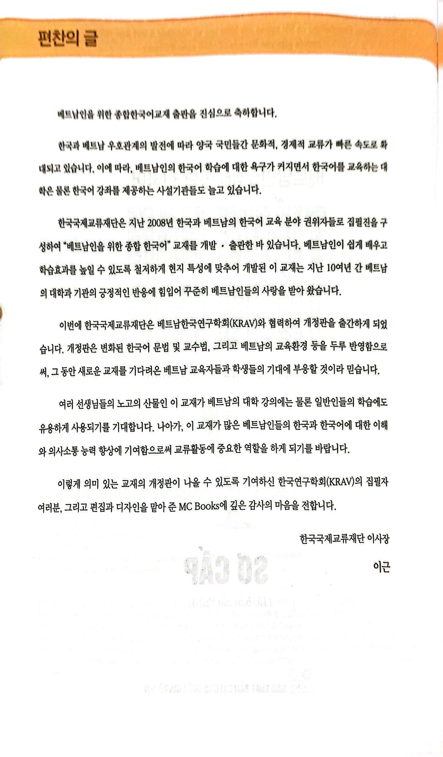 Hiểu được điều đó, ngày 4-7, Đại diện chính phủ Hàn Quốc, ngài Woo Hyeong Min – Trưởng đại diện Văn phòng Quỹ giao lưu Quốc tế HQ tại Việt Nam cùng ƯT Mai Ngọc Chừ – Chủ tịch Hội Nghiên cứu khoa học về Hàn Quốc của Việt Nam (KRAV) đã trao quyết định cho phép Công ty Cổ phần sách MCBooks của Việt Nam được xuất bản cuốn sách này tại thị trường Việt Nam. Và đây chính là bộ giáo trình tiếng Hàn tổng hợp đầu tiên có bản quyền chính thức có mặt tại Việt Nam.