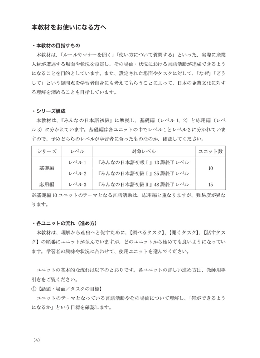 Giáo trình giúp học viên biết cách sử dụng tiếng Nhật chính xác trong các tình huống và bối cảnh thường gặp trong thực tế tại các công ty, nhà máy ở Nhật Bản. Ngoài ra, học viên cũng phát triển dần kỹ năng đặt vấn đề nghi vấn "tại sao", "như thế nào" đối với các tình huống, bối cảnh được đặt ra trong giáo trình, qua đó nắm bắt sâu sắc hơn về văn hóa doanh nghiệp Nhật Bản.