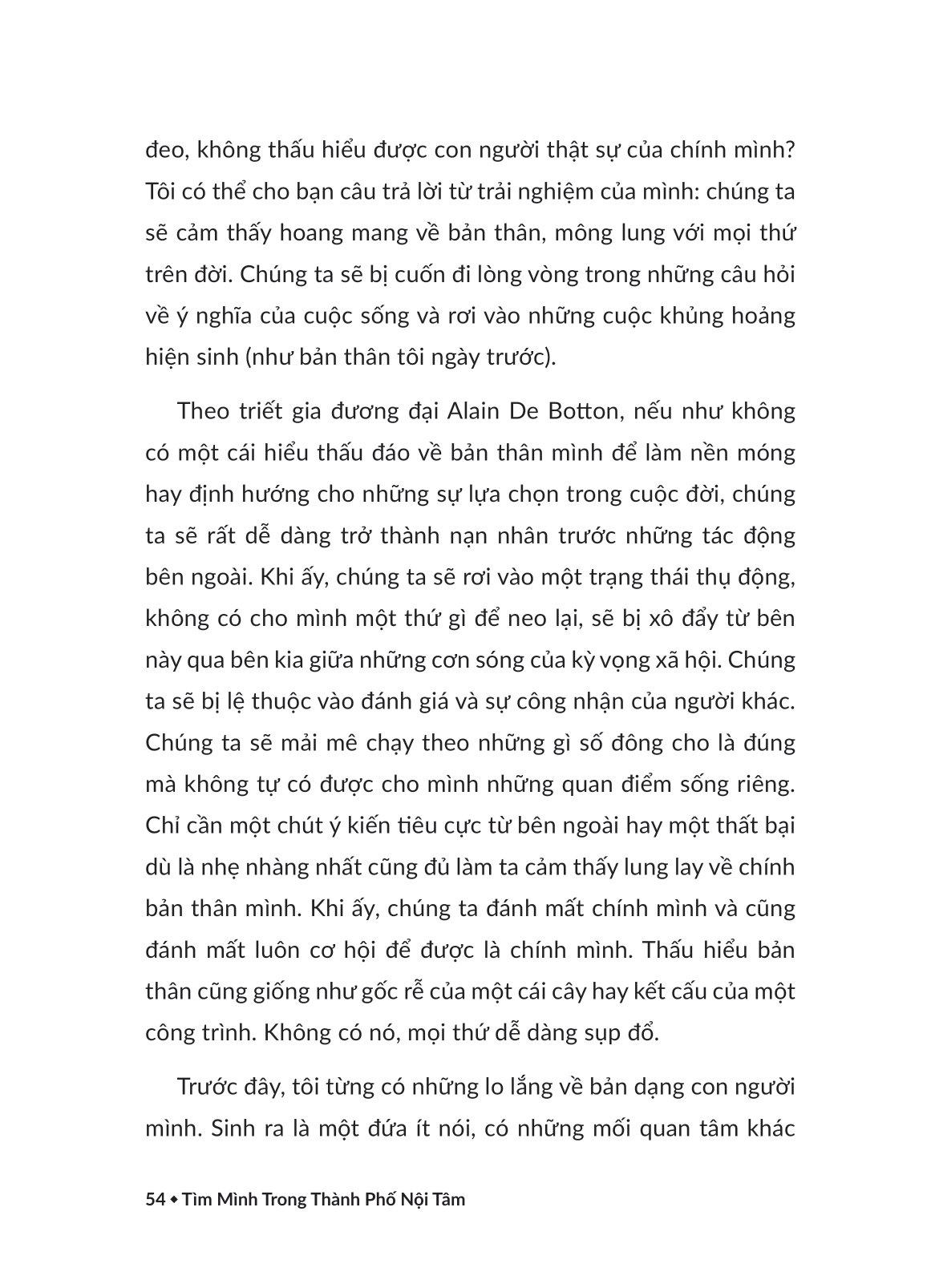 Cùng những chương sách được trải ra như một tấm bản đồ, Tìm m.ình trong thành phố nội tâm sẽ từng bước dẫn dắt bạn khám phá không gian nhiệm màu ấy, lý giải các diễn biến tinh thần thông qua lăng kính của Triết học và Tâm lý học cùng những góc nhìn và câu chuyện đã được chứng minh. Cuốn sách sẽ giúp bạn tiến đến ngưỡng hạnh phúc thật sự khi hiểu rõ về bản thân, sống hòa hợp được với cả thế giới bên trong và bên ngoài m.ình.