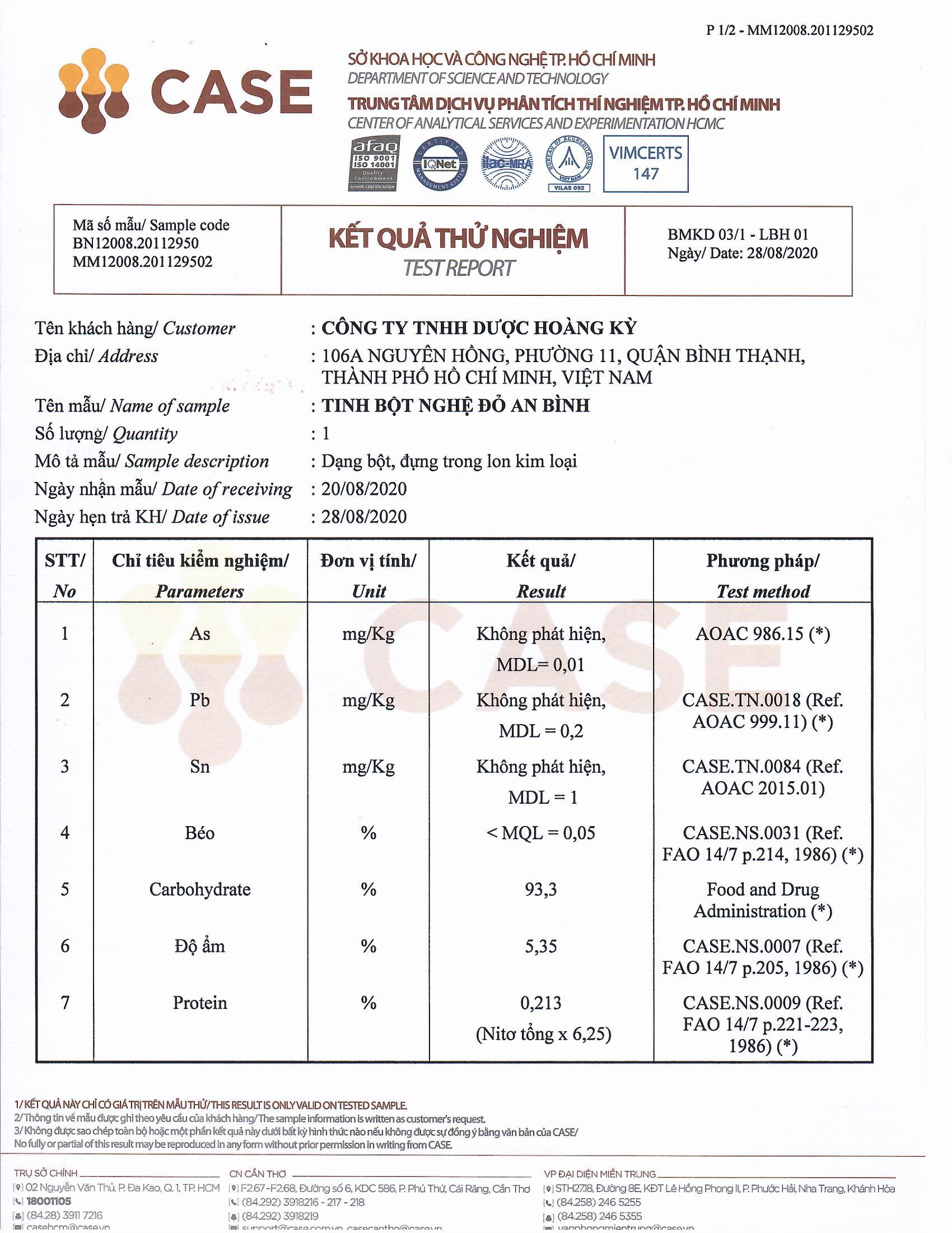 TINH BỘT NGHỆ ĐỎ AN BÌNH Thành phần: 100% tinh bột nghệ đỏ Kon Tum - nơi chuyên canh dòng nghệ nếp đỏ siêu Curcumin. Hàm lượng curcumin: 10.00mg/kg (gấp 26 lần sản phẩm thông thường). Màu sắc: Vàng tươi. Xuất xứ: Kontum - Việt Nam. Hạn sử dụng: 1 năm kể từ ngày sản xuất. Quy cách đóng gói: Lon thiếc 500gr. Sản phẩm Tinh bột nghệ đỏ An Bình đã được kiểm định chất lượng (có giấy chứng nhận) có 4 ƯU ĐIỂM vượt trội: