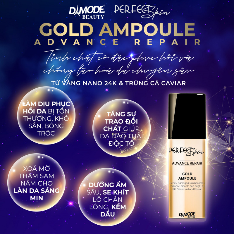 Tên: Tinh chất cô đặc Advance Repair Gold Ampoule Xuất xứ: Hàn Quốc Thương hiệu: Damode Beauty Quy cách: 15ml Gold Ampoule tinh chất phục hồi chống lão hóa Thành phần tinh chất cô đặc phục hồi và chống lão hóa da GOLD AMPOULE Dung dịch cô đặc Advance Repair Gold Ampoule được kết tinh từ hai thành phần chính là: Vàng nano 24K ngăn chặn các vết nhăn, triệt tiêu các độc tố tích tụ trong da, hạn chế mụn từ bên trong. Trứng cá Caviar chiết xuất có chứa omega – 3, vitamin A, D, B1. B2, B6 giúp tăng cường độ ẩm cho da, tăng sinh collagen và elastin, đồng thời giảm tốc độ lão hóa. Ngoài ra, sản phẩm còn có sự kết hợp của các thành phần như: chiết xuất dâu tằm, quả lý gai Ấn Độ, cây phỉ, Niacinamide, Axit hyaluronic,… Thành phần Gold Ampoule Damode tinh chất phục hồi chống lão hóa Công dụng tinh chất cô đặc phục hồi và chống lão hóa da GOLD AMPOULE Dung dịch cô đặc Advance Repair Gold Ampoule được kết hợp từ nhiều thành phần quý, có những tác dụng với làn da như: Cải thiện và ngăn ngừa nếp nhăn, giảm tốc độ lão hóa da, tăng độ đàn hồi cho da. Cấp ẩm cho da, tăng cường dưỡng chất nuôi dưỡng, cải thiện đốm nâu giúp chị em có làn da căng tràn, láng mịn. Tăng sinh collagen và elastin giúp cấu trúc da đàn hồi hơn, hạn chế tình trạng da khô và bong tróc. Tinh chất vàng nano 24K trong sản phẩm giúp triệt tiêu các độc tố, làm dịu, phục hồi và tái sinh làn da bị tổn thương do mụn hoặc tác động của tia laser. Niacinamide và axit hyaluronic trong tinh chất cô đặc Advance Repair Gold Ampoule cấp ẩm liên tục cho da, giúp se khít lỗ chân lông và kiềm dầu. Nhờ sự kết hợp của các dưỡng chất quý, sản phẩm giúp chị em có làn da rạng rỡ hơn, duy trì nét thanh xuân trên gương mặt. Hướng dẫn sử dụng tinh chất cô đặc Advance Repair Gold Ampoule Để đạt được hiệu quả khi sử dụng, lấy lại vẻ thanh xuân trên gương mặt, các chị em cần lưu ý một số vấn đề sau: Đối tượng sử dụng: Các chị em đang gặp vấn đề về da như mụn, sạm, nám, tàn nhang, da khô bong tróc, có dấu hiệu lão hóa như nếp nhăn,… Cách dùng: Lấy một lượng sản phẩm vừa đủ, chấm đều lên 5 điểm trán, mũi, cằm, và hai bên má, sử dụng sau bước kem tẩy trang, nước thần tái tạo phục hồi trắng sáng và đắp mặt nạ tinh chất cô đặc.