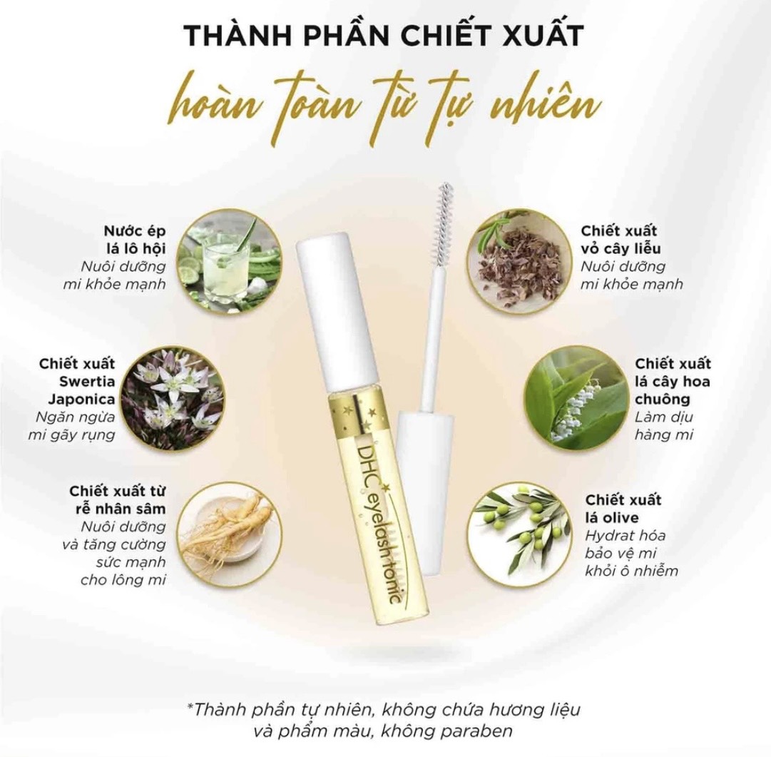 - Tinh chất dưỡng mi DHC Eyelash Tonic làm hoàn toàn từ các nguyên liệu tự nhiên nhằm tái tạo, nuôi dưỡng hàng mi bị tổn thương. Sản phẩm giữ vị trí số 1 tại nhiều website mỹ phẩm. CÔNG DỤNG DƯỠNG MI DHC: