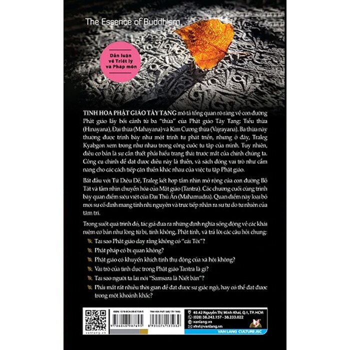 TINH HOA PHẬT GIÁO TÂY TẠNG mô tả tổng quan rõ ràng về con đường Phật giáo lấy bối cảnh từ ba “thừa” của Phật giáo Tây Tạng: Tiểu thừa (Hinayana), Đại thừa (Mahayana) và Kim Cương thừa (Vajrayana). Ba thừa này thường được trình bày như một trình tự phát triển, nhưng ở đây, Traleg Kyabgon xem trọng như nhau trong công cuộc tu tập của mình. Tuy nhiên, điều cơ bản là sự cần thiết phải hiểu trạng thái trước mắt của chính chúng ta. Công cụ chính để đạt được điều này là thiền, và sách đóng vai trò như cẩm nang cho các cách tiếp cận thiền khác nhau của việc tu tập Phật giáo.