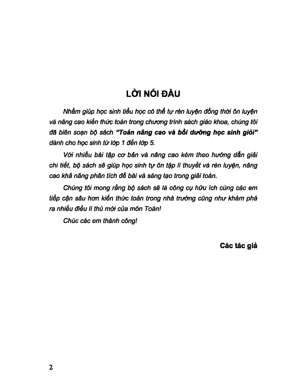 Nhằm giúp học sinh tiểu học có thể tự rèn luyện đồng thời ôn luyện và nâng cao kiến thức toán trong chương trình , chúng tôi đã biên soạn bộ sách "Toán nâng cao và bồi dưỡng học sinh giỏi" dành cho học sinh từ đến Được biên soạn và hướng dẫn giải theo phương pháp tự luận, bộ sách sẽ giúp học sinh tự ôn tập lí thuyết và rèn luyện, nâng cao khả năng phân tích đề bài và sáng tạo trong giải toán. Bộ sách sẽ công cụ hữu ích cùng các em tiếp cận sâu hơn với kiến thức toán trong nhà trường cũng như khám phá ra nhiều điều lí thú mới của môn Toán!