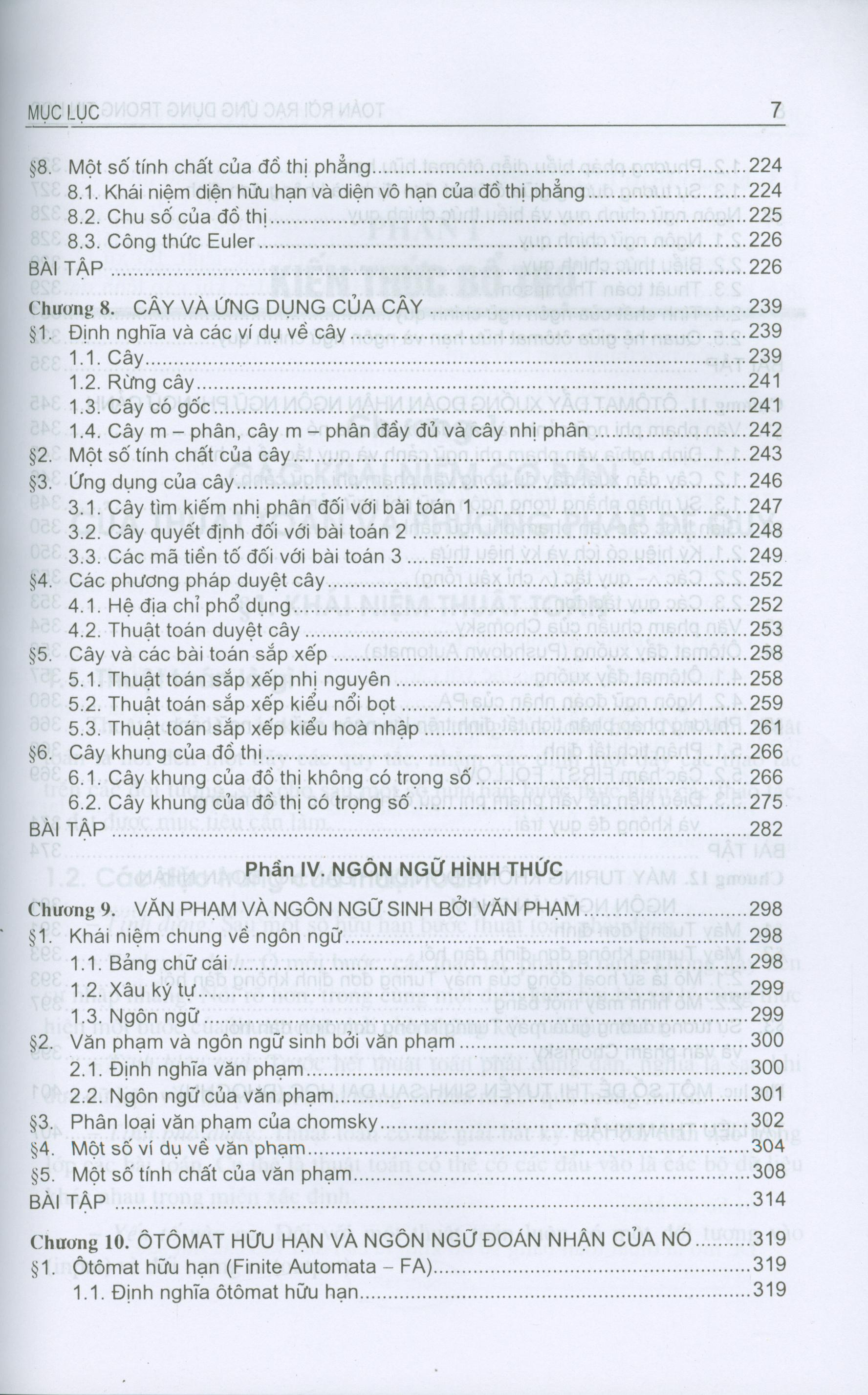 - Phần IV. Ngôn ngữ hình thức. Cuốn Toán rời rạc ứng dụng trong tin hoc trình bày các vấn đề toán học cơ bản nhất, nhưng lại hết sức thiết yếu và cần thiết đối với những ai muốn có được các kiến thức tin học vững chắc. Cuốn sách giúp người học hiểu được lý thuyết thấu đáo, rèn luyện tư duy khoa học, kỹ năng tính toán và khả năng vận dụng toán học vào giải quyết vấn đề, kích thích niềm say mê học tập và từ đó nâng cao kỹ năng thực hành, tư duy sáng tạo khi học các môn học cơ sở và chuyên ngành Công nghệ thông tin tiếp theo. Cuốn sách này cũng rất bổ ích cho việc ôn thi tuyển sinh sau đại học ngành Công nghệ thông tin được tổ chức hàng năm ở Đại học Quốc gia Hà Nội.