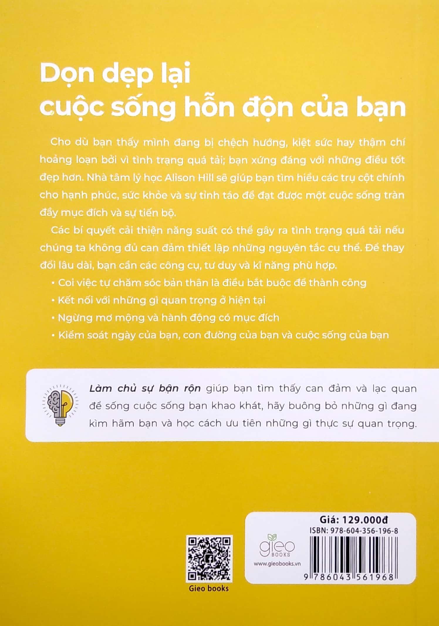 Tối Ưu Hóa Bản Thân - Làm Chủ Sự Bận Rộn Làm chủ sự bận rộn chỉ cho bạn cách ngưng làm việc quá tải và thay vào đó bắt đầu đạt được kết quả tích cực hơn. Chúng ta có thể hoàn toàn làm chủ bản thân và mọi điều trong cuộc sống, lẫn công việc, cả tích cực lẫn tiêu cực, để từ đó xây dựng được nền tảng trải nghiệm một cuộc sống khác biệt. Tất cả chúng ta đều bận rộn, nhưng làm việc chăm chỉ hơn và làm nhiều hơn không giúp chúng ta đi đến đâu. Chúng ta bị choáng ngợp, mất tập trung và tách biệt, và nỗi sợ hãi lớn nhất của chúng ta là điều này sẽ không bao giờ thay đổi. Chúng ta cần một cách tiếp cận khác mà không phải đánh đổi những điều thiết yếu trong cuộc sống cũng như không ép buộc bản thân làm việc nhiều hơn. Cuốn sách này là bản hướng dẫn để bạn lấy lại cuộc sống hạnh phúc của mình. Thông qua các mô hình đơn giản, những chẩn đoán mạnh mẽ cùng đề xuất thực tế, bạn sẽ xác định được trạng thái hiện tại của mình và cách thay đổi thực sự. Khám phá cách để bạn bước ra khỏi trạng thái Check Out (Chệch hướng ra khỏi thế giới thực tại), chống lại Burn Out (cảm giác lao lực như bạn đang tập luyện trên máy chạy bộ cường độ cao khiến chân, não và năng lực của bạn bị mất kiểm soát và có thể ngã xuống bất cứ lúc nào) và vượt qua Freak Out (cảm giác hoảng loạn, lo lắng quá mức được tạo ra khi bạn biết mình muốn đi đâu nhưng chật vật để tạo ra bước tiến có ý nghĩa). Qua các chương sách, từng trạng thái sẽ được mô tả, giải thích kĩ lưỡng bằng khoa học cùng những câu chuyện đời thực, trải nghiệm của chính tác giả, và phần ‘bí kíp cuộc sống’ sẽ cung cấp những ý tưởng mà bạn có thể thực hiện ngay lập tức. Mục tiêu không phải là tìm ra một niềm đam mê đích thực của bạn, mà xác định điều gì là quan trọng nhất ngay bây giờ. Khi bạn rõ ràng về mục đích và thực sự đạt được tiến bộ, bạn đã đạt được đến trạng thái Stand out (Nổi bật), cho phép tài năng của bạn tỏa sáng. Tuy nhiên, bạn cũng cần phải nhớ rằng các bí quyết cải thiện năng suất có thể gây ra tình trạng quá tải nếu chúng ta không đủ can đảm thiết lập những nguyên tắc cụ thể. Để thay đổi lâu dài, bạn cần các công cụ, tư duy và kĩ năng phù hợp, ví dụ như: Coi việc tự chăm sóc bản thân là điều bắt buộc để thành công Kết nối với những gì quan trọng ở hiện tại Ngừng mơ mộng và hành động có mục đích Kiểm soát ngày của bạn, con đường của bạn và cuộc sống của bạn Làm chủ sự bận rộn giúp bạn tìm thấy can đảm và lạc quan để sống cuộc sống bạn khao khát, hãy buông bỏ những gì đang kìm hãm bạn và học hỏi cách để ưu tiên những gì thực sự quan trọng. Hãy ghi nhớ rằng sự bận rộn đang trở thành một huy hiệu danh dự, dù nó kì quặc, không thoải mái và không phù hợp với bất kì bộ trang phục nào của bạn; và “kiệt sức đã trở thành một biểu tượng trạng thái”. Chúng ta đang tham gia vào một cuộc đua trong đó người kiệt sức nhất sẽ là người chiến thắng. Vậy nên bạn hãy tự tìm thấy động lực để vực dậy và khởi động lại giữa mớ hỗn độn, để đón nhận những điều tốt đẹp nhất mà cuộc sống ban tặng. Điều đặc biệt nhất ở cuốn sách này là “bản kế hoạch làm chủ sự bận rộn” để độc giả tự thiết kế, biến ý tưởng và mong muốn của bản thân thành hành động theo từng cột mốc thời gian, những gì bạn trân quý và trải nghiệm cũng như tốc độ của chính bạn, chứ không phải theo bất cứ hình mẫu nào. Bạn hãy là chính bạn, hãy bứt phá để nổi bật và đạt được thành quả mà bạn khát khao! Thông tin về tác giả Alison Hill là nhà tâm lý học “ngầu” nhất nước Úc. Cô thường xuyên xuất hiện trên các phương tiện truyền thông báo chí và truyền hình chính thống. Cô là đồng sáng lập của Pragmatic Thinking – một công ty chuyên xây dựng chiến lược hành vi và động lực cho các đối tác khách hàng như Pepsico, Suncorp, McDonalds, Bond University hay Siemens. Các cá nhân, đội nhóm và tổ chức luôn săn đón Ali để mong được cô hỗ trợ cách tạo ra thay đổi. Cô thường chia sẻ thông điệp độc đáo và chân thực bằng sự hài hước, tính thực tế và tư duy thực tế đầy lôi cuốn. Hill còn là đồng tác giả của cuốn sách kinh doanh bán chạy nhất có tựa Dealing with the tough stuff: How to achieve results from key conversations (tạm dịch: Đương đầu với thử thách: Cách chinh phục mục tiêu từ những cuộc trò chuyện quan trọng). Cuốn sách đã được dịch sang ba ngôn ngữ và chuẩn bị tái bản lần hai.
