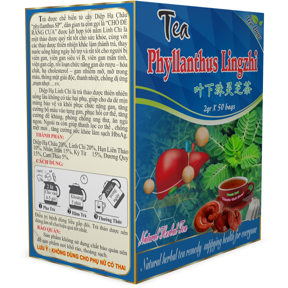 Trà được chế biến từ cây Diệp Hạ Châu “phyllanthus SP”, dân gian ta còn gọi là “CHÓ ĐẺ RĂNG CƯA” được kết hợp với nấm Linh Chi là một thảo dược quý rất tốt cho sức khỏe, cùng với các thảo dược thiên nhiên khác làm thành trà, thay nước uống hằng ngày hỗ trợ và rất tốt cho người bị viên gan, viên gan siêu vi B, viên gan mãn tính, viên gan cấp, rối loạn chức năng gan do rượu – hóa chất, hạ cholesterol – gan nhiễm mỡ, mỡ trong máu, thông mật giải độc, thanh nhiệt, chống dị ứng, mụn nhọt …vv.