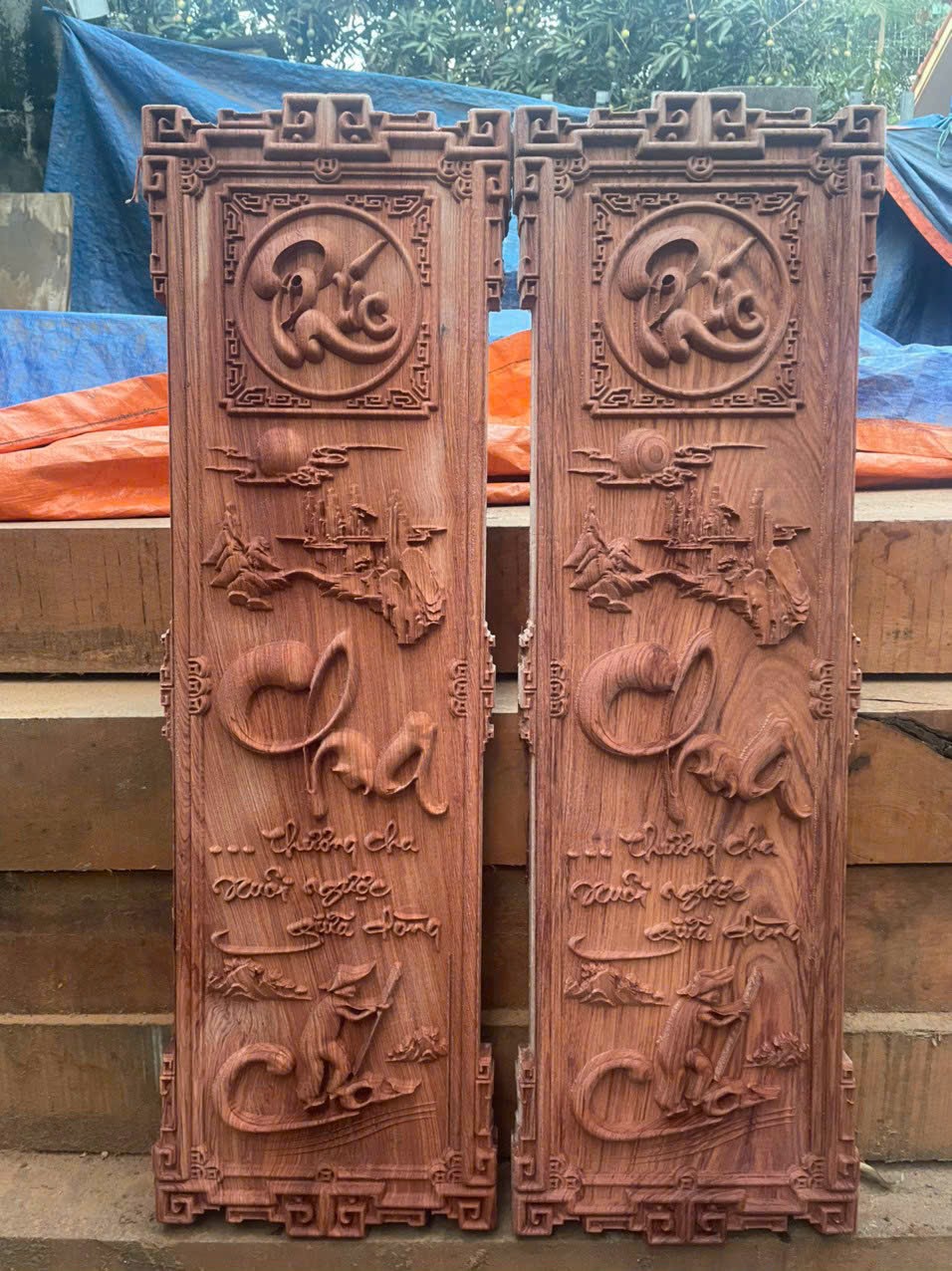 _ Cặp trang được khắc nổi tỉ mỉ ,tinh xảo kỳ công .Đi hầu hết tất cả mọi chi tiết góc ngách nội dung hoa văn của cặp tranh đều được gọt tỉa chỉnh sửa sắc nét hoàn toàn bằng tay thủ công .Đồng thời tranh được kiểm định kỹ lưỡng khắt khe ,như cho vào thẩm sấy cho gỗ khô kiệt .Mục đích chống dập nứt vênh mo mối mọt .Kết hợp với trà nhám đánh giấy giáp nhiều nước sờ mát lạnh .Song cho vào phun lót làm bóng mờ để giữ lại mầu sắc vân gỗ tự nhiên .Đẹp long lanh như ảnh trên .Câu đối được làm và hoàn thiện do bàn tay khối óc tài hoa .Từ những người thợ giàu kinh nghiệm cũng như tay nghề cao trong làng nghề truyền thống