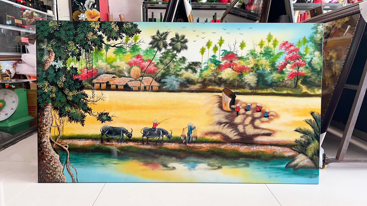Tất cả tranh sơn mài được sử dụng màu vẽ, sơn PU với chất lượng tốt giúp tranh luôn giữ được màu vẽ, độ bóng bền vững theo thời gian. Đồng quê Việt Nam luôn là nguồn cảm hứng bất tận của những người nghệ sĩ yêu quê hương. Những cánh đồng lúa bạt ngàn, những con người lao động chân chất nhưng cần cù chịu thương chịu khó là những nét đẹp của đất nước trong mắt nhân dân và bạn bè quốc tế.