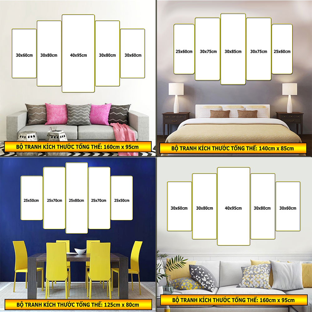 - NỘI DUNG, CHỦ ĐỀ, KHÔNG GIAN ỨNG DỤNG: Tranh treo phù hợp cho các không gian như phòng khách, phòng ngủ, phòng ăn hoặc các phòng chức năng khác trong không gian nhà ở gia đình. Xu hướng sử dụng tranh bộ, tranh ghép trong trang trí nội thất đang lên ngôi trong những năm gần đây. Dòng tranh hiện đại này không những đẹp, bền, nhẹ, dễ dàng lắp đặt.Dòng tranh bộ với nhiều chủ đề khác nhau rất dễ phối hợp trong các không gian nội thất, bạn có thể treo tranh với bất kỳ các mảng tường trống trải nào trong phòng ngủ, phòng khách, hay phòng ăn, bạn cũng có thể treo tại các không gian công cộng khác như văn phòng làm việc, quán coffe, spa hay bất cứ nơi nào bạn thấy thích. Tranh nghệ thuật treo tường là một trong những điểm nhấn trong căn nhà của bạn, giúp không gian nhà ở thêm ấn tượng, đẹp mắt. Đối với những sành nghệ thuật thì đây chính là thú vui tao nhã, tăng thêm niềm hứng khởi, động lực cho ngày làm việc mới hay có những phút giây thư giãn thoải mái khi quay trở về mái ấm của mình.