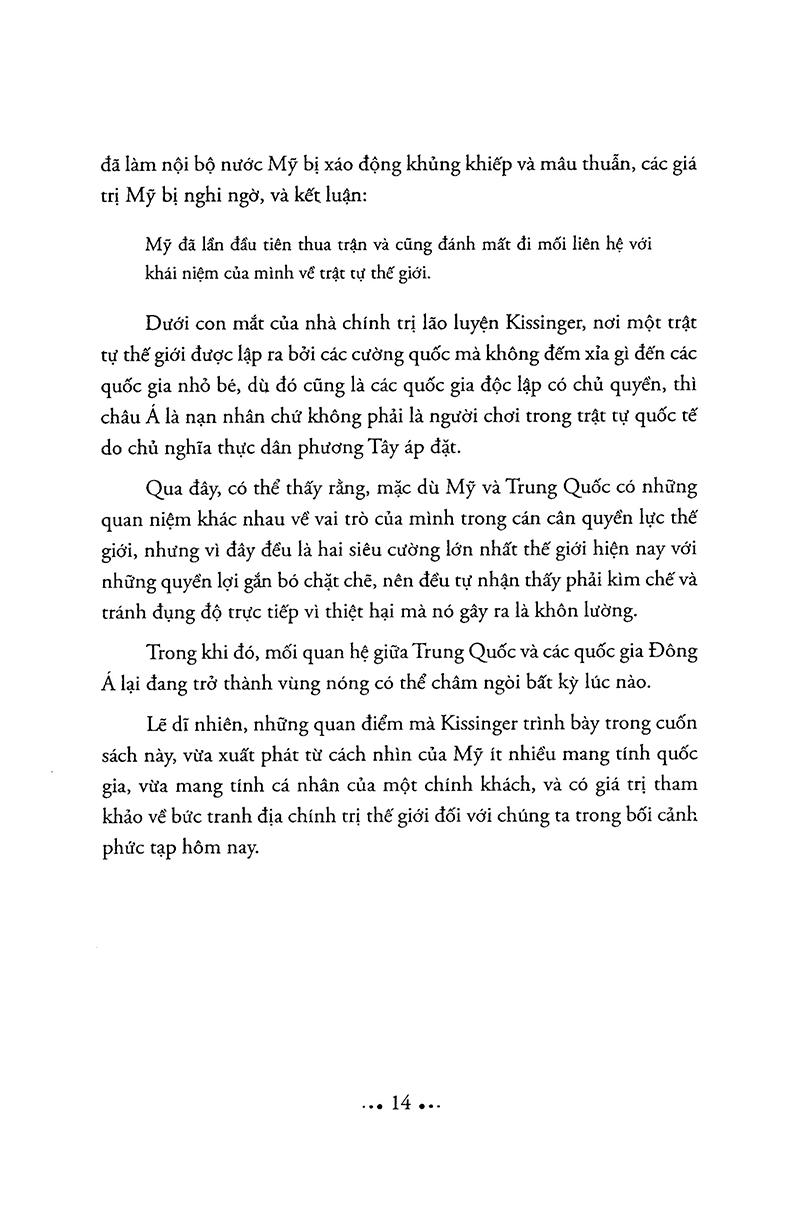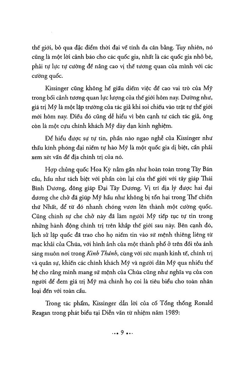 Mua tại TiktokTrật Tự Thế Giới (Tái Bản 2023) Trong tác phẩm, Kissinger xuất phát từ Hòa ước Westphalia để phân tích về tương quan giữa các nước, chủ yếu là các cường quốc và các khu vực giữ một vai trò đặc biệt đối với bức tranh địa chính trị thế giới, với những khác biệt trong thế giới quan và vị trí địa lý đã ảnh hưởng đến chính sách ngoại giao của mỗi nước như thế nào. Tác giả dành chương cuối (chương 9) để bàn về vấn đề toàn cầu hoá trong thời đại khoa học công nghệ, đặc biệt là tin học và truyền thông đại chúng lan tràn đã tác động mạnh mẽ đến dư luận, các nhà lãnh đạo và các quyết định chính trị hiện nay. Theo cách nhìn của Kissinger thì trật tự thế giới ngày nay cần được đặt trên hai yếu tố căn bản: