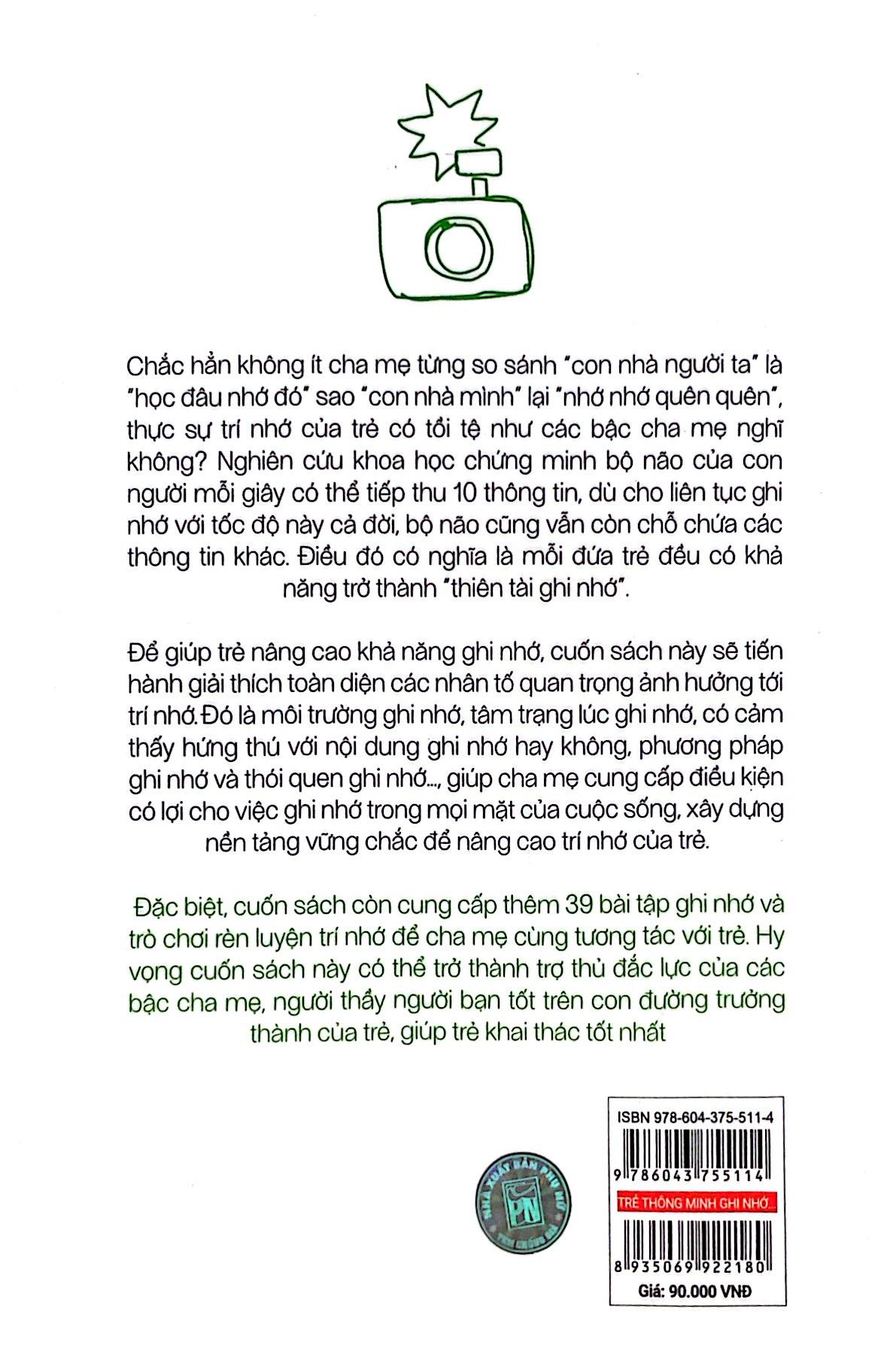 Đặc biệt cuốn sách còn cung cấp thêm 39 bài tập ghi nhớ và vai trò chơi rèn luyện trí nhớ ,để cho mẹ cùng tương tác với trẻ hy vọng cuốn sách này sẽ trở thành trợ thủ đắc lực của các bậc cha mẹ, người thầy người bạn tốt trên con đường trưởng thành của trẻ giúp trẻ khai thác tốt nhất .