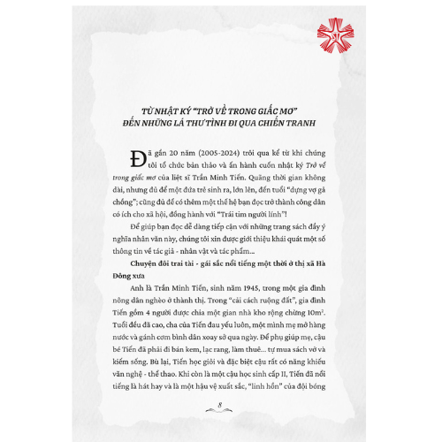 Cuốn sách Trở về trong giấc mơ được nhà văn Đặng Vương Hưng sưu tầm, tuyển chọn, tập hợp từ những trang nhật ký của liệt sĩ Trần Minh Tiến viết trong khoảng thời gian từ tháng 11/1966 đến tháng 3/1968, ghi lại những tháng ngày tập luyện gian nan, vất vả để chuẩn bị cho cuộc hành quân vượt Trường Sơn vào miền Nam chiến đấu.