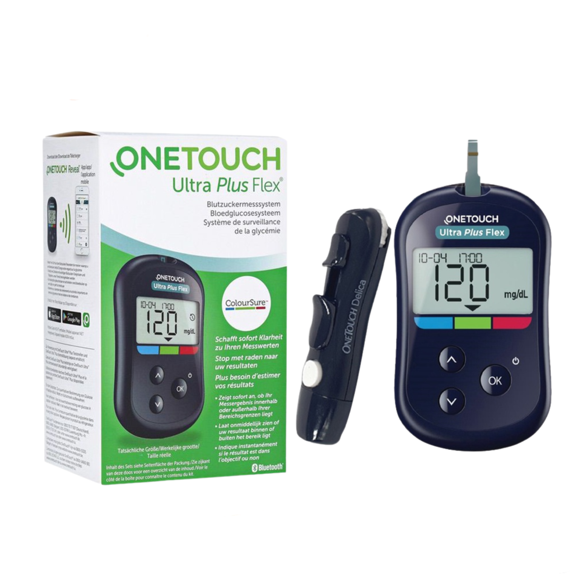 Trọn bộ máy test tiểu đường OneTouch Ultra Plus Flex bao gồm + 01 máy đo đường huyết OneTouch Ultra Plus Flex + 01 bút lấy máu OneTouch Delica plus hoặc bút láy máu OneTouch