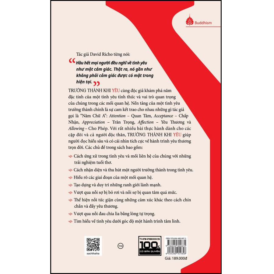 Trưởng thành khi yêu cùng độc giả khám phá năm đặc tính của một tình yêu tỉnh thức và vai trò quan trọng của chúng trong các mối quan hệ. Nền tảng của một tình yêu trưởng thành chính là sự cam kết trao cho nhau những gì tác giả gọi là “Năm Chữ A”: Attention – Quan Tâm, Acceptance – Chấp Nhận, Appreciation – Trân Trọng, Affection – Yêu Thương và Allowing – Cho Phép. Với rất nhiều bài thực hành dành cho các cặp đôi và cả người độc thân, Trưởng thành khi yêu giúp người đọc hiểu sâu và có cái nhìn tích cực về hành trình yêu thương trọn đời.