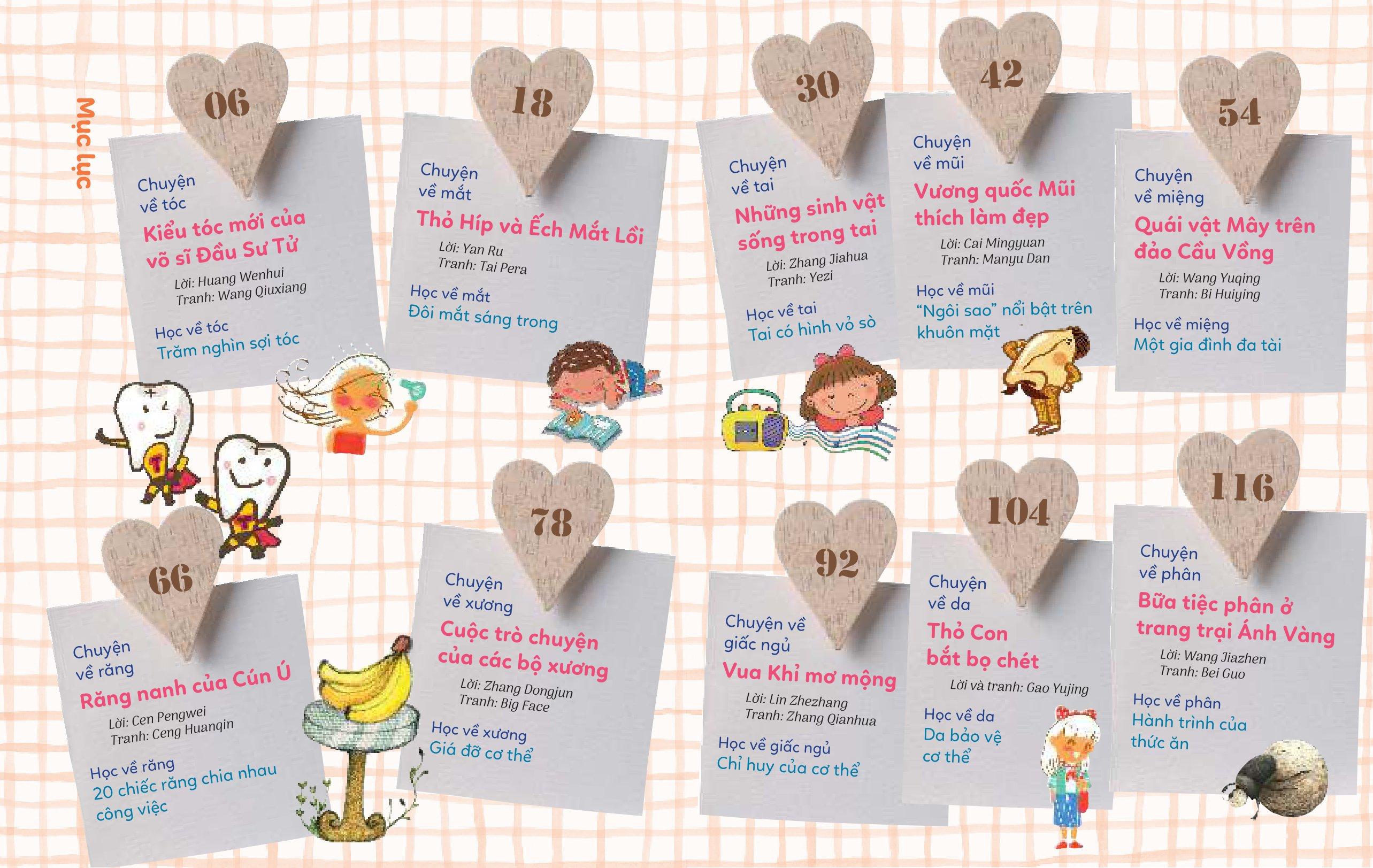 Truyện Kể Và Kiến Thức Dành Cho Lứa Tuổi Nhi Đồng – Tập 1 – Cơ Thể Người – Vương Quốc Mũi Thích Làm Đẹp bao gồm 10 chủ đề thú vị xoay quanh cơ thể người: da, tóc, mắt, mũi, miệng, răng, xương, giấc ngủ, làn da, và thậm chí là phân. Mười câu chuyện hấp dẫn với những góc nhìn khoa học thú vị góp phần kích thích trí tò mò, khuyến khích trẻ đi tìm câu trả lời cho những câu hỏi như: Mũi có chức năng gì? Tại sao lại cầ đi ị? Con người có bao nhiêu sợi tóc?