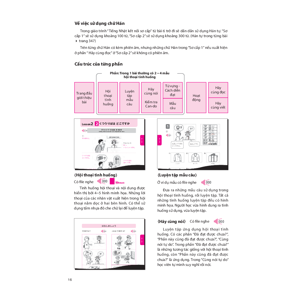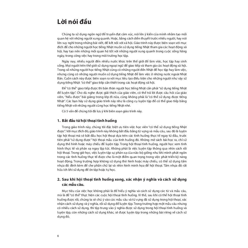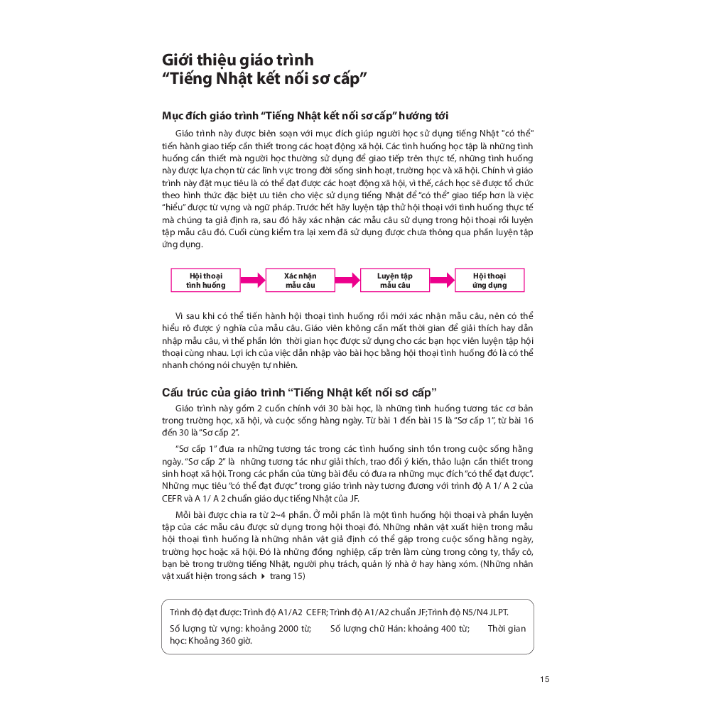 Mua tại TiktokGiới thiệu sách Giáo trình được biên soạn nhằm giúp người học giao tiếp bằng tiếng Nhật tốt hơn trong các hoạt động xã hội. Các tình huống học tập trong giáo trình là những tình huống thường được sử dụng để giao tiếp trên thực tế, được lựa chọn từ các lĩnh vực trong đời sống sinh hoạt, trường học và xã hội. Cách học được tổ chức theo hình thức đặc biệt ưu tiên việc "Giao tiếp" hơn là "Hiểu" từ vựng và ngữ pháp. [Hội thoại tình huống -> Xác nhận mẫu câu -> Luyện tập mẫu câu -> Hội thoại ứng dụng] Giáo trình bao gồm 2 sách giáo khoa sơ cấp 1, 2, hai quyển Work book sơ cấp 1,2 và 1 quyển Bản dịch và giải thích ngữ pháp.