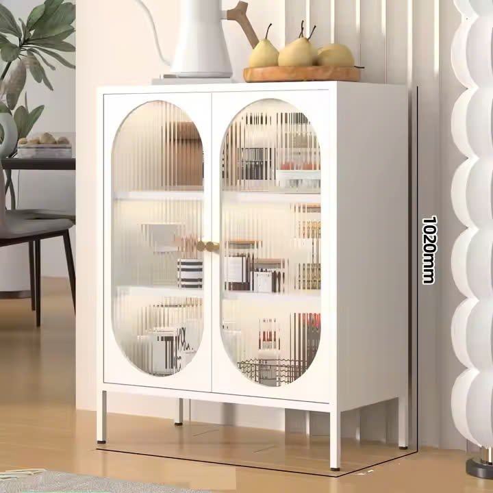✨Tủ bếp hiện đại Bắc Âu Phòng ăn Phòng khách Tủ bếp màu trắng đen Cửa cong đôi trong suốt Tủ đựng đồ bằng thép