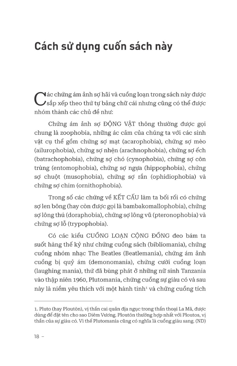 - Publishers Weekly MỘT SỐ TRÍCH ĐOẠN “Các số liệu trên nói về các chứng rối loạn ám ảnh sợ hãi ảnh hưởng đến cuộc sống thường nhật. Nhiều người trong số chúng ta có những cảm giác khó chịu hay sợ hãi nhẹ hơn mà đôi khi lầm tưởng là ám ảnh sợ hãi: cực kỳ không thích nói trước đám đông, đi gặp nha sĩ, nghe tiếng sấm sét hoặc nhìn thấy nhện. Ở Mỹ, có hơn 70% người nói rằng họ có một nỗi sợ vô cớ. Khi bắt đầu nghiên cứu để viết cuốn sách này, tôi không nghĩ rằng mình có chứng sợ hãi cụ thể nào – ngoại trừ nỗi sợ việc bị đỏ mặt khi còn niên thiếu và cảm giác lo lắng thường trực về việc đi máy bay –nhưng đến thời điểm cuốn sách hoàn thành, tôi đã thuyết phục bản thân rằng mình có gần như tất cả những ám ảnh sợ hãi đó. Một số nỗi sợ cảm nhận được ngay khi ta hình dung tới.” “Các nhà tâm lý học tiến hóa tranh luận rằng nhiều chứng ám ảnh sợ hãi mang tính thích nghi: nỗi sợ độ cao và loài rắn được in hằn trong não bộ để ngăn ta ngã từ trên cao hoặc bị rắn cắn; sự ghê tởm với chuột và ốc sên bảo vệ ta khỏi bệnh tật. Các chứng ám ảnh sợ hãi như vậy là một phần di sản tiến hóa của loài người, những nỗi sợ “được chuẩn bị sẵn về mặt sinh học” được thiết kế để bảo vệ ta khỏi các mối đe dọa bên ngoài. Phản ứng với ám ảnh sợ hãi phần nào giống những phản xạ mang tính bản năng. Khi phát hiện đối tượng hay tình huống là mối đe dọa, bộ não nguyên thủy sẽ giải phóng các hóa chất giúp ta chiến đấu hoặc bỏ trốn, và phản ứng thể chất của ta – rùng mình hay chùn bước, đổ mồ hôi hay buồn nôn – dường như xâm chiếm lấy ta.” “Khi quyết định một hành vi là cuồng loạn hay ám ảnh, ta thực chất đang vẽ ra ranh giới về văn hóa và tâm lý cho chính mình, nghĩa là chỉ ra những niềm tin mà với nó, xã hội của mình được kiến tạo. Những ranh giới ấy chuyển dịch theo thời gian, và trong khoảnh khắc khủng hoảng tập thể – chiến tranh, bệnh dịch – chúng có thể thay đổi nhanh chóng.” “Ám ảnh sợ hãi hay cuồng loạn cũng giống như thần chú, ban cho một vật thể hay hành vi những ý nghĩa bí ẩn và sức mạnh để tạo thành ám ảnh và biến đổi chúng ta. Những tình trạng ấy có thể tạo ra cảm giác áp chế, nhưng cũng phù phép lên thế giới quanh ta, khiến nó trở nên đáng sợ và sinh động như trong cổ tích. Chúng tạo ra một tác động hữu hình, hệt như phép thuật, và khi ấy ta bộc lộ sự kỳ lạ của bản thân.”
