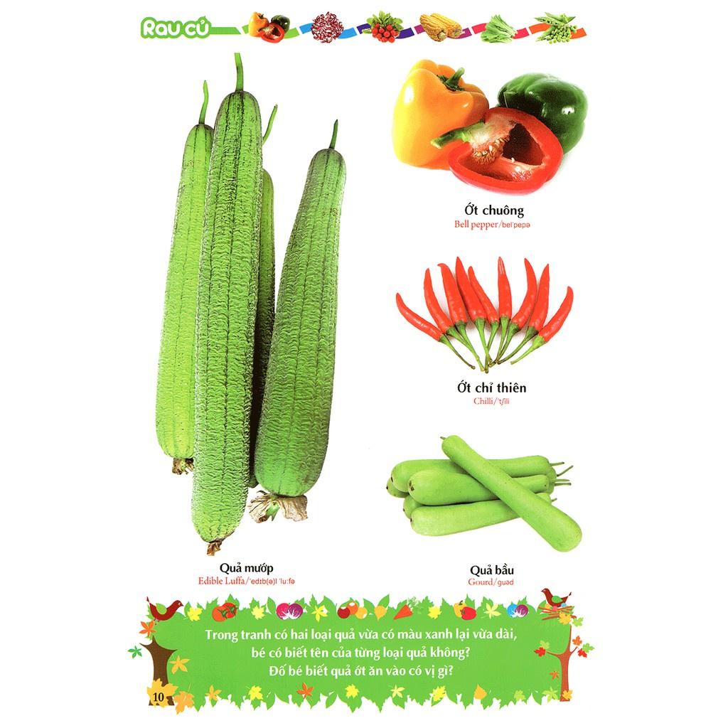 Sách: Từ Điển Tranh Về Rau - Củ - Quả - Hoa Tái Bản (Bìa Mềm) Từ Điển Tranh Về Rau - Củ - Quả - Hoa Sách giáo dục tri thức dành cho trẻ em với cách trình bày sáng tạo kèm hình ảnh minh họa màu tươi sáng, đẹp mắt. Các bé sẽ tiếp thu những kiến thức phong phú về môi trường xung quanh một cách tự nhiên nhưng không kém phần hứng thú và bạn cũng sẽ có những giây phút vui đùa cùng bé. Cuốn sách với nhiều hình ảnh sinh động về các loại rau củ quả khác nhau giúp bé phát triển khả năng nhận biết. Cuốn sách còn là bộ sưu tập với nhiều hình ảnh gần gũi quen thuộc giúp bé trở nên thích thú.  Bên cạnh đó hình thức song ngữ giúp bé gia tăng vốn từ vựng cả về Tiếng Việt lẫnn Tiếng Anh. Cuốn sách cũng là tài liệu học từ vựng cho bất cứ bạn nhỏ nào yêu thích môn Tiếng Anh. Các bạn nhỏ có thể vừa học được từ vựng vừa học được cách phát âm. Phần cuối của mỗi trang sách còn có phần câu đố vui giúp bố mẹ, thầy cô có thể tương tác với trẻ, giúp trẻ nhớ lâu hơn.  Chính vì vậy cuốn sách chính là món quà vô giá mà các bậc phụ huynh và cô giáo dành cho con em mình chuẩn bị hành trang cắp sách đến trường.